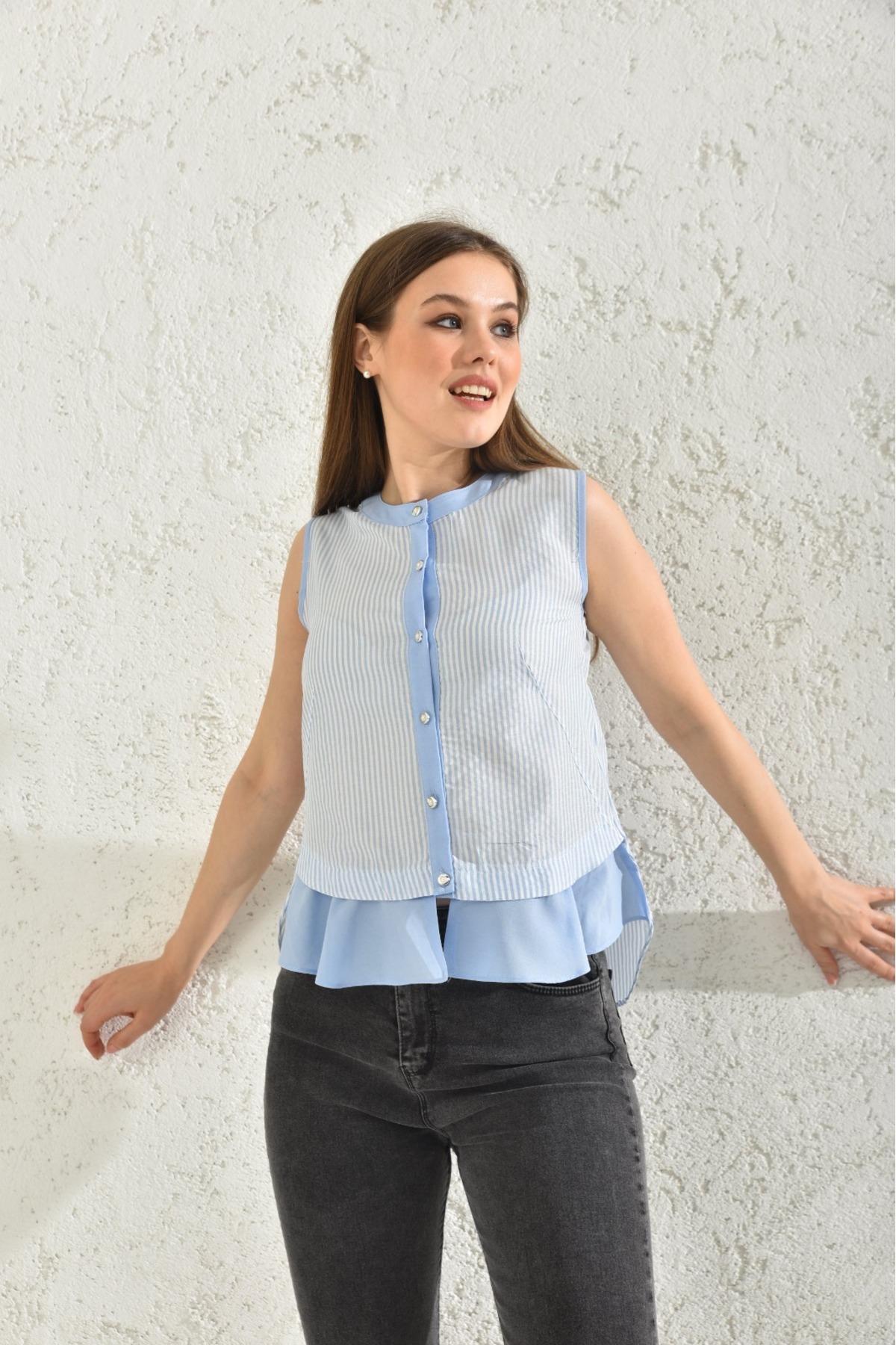 Kadın Mavi Kalp Detaylı Ön Bağcıklı Çizgili Gömlek Kadın Mavi Kalp Detaylı Ön Bağcıklı Çizgili Gömlek LC1042 L