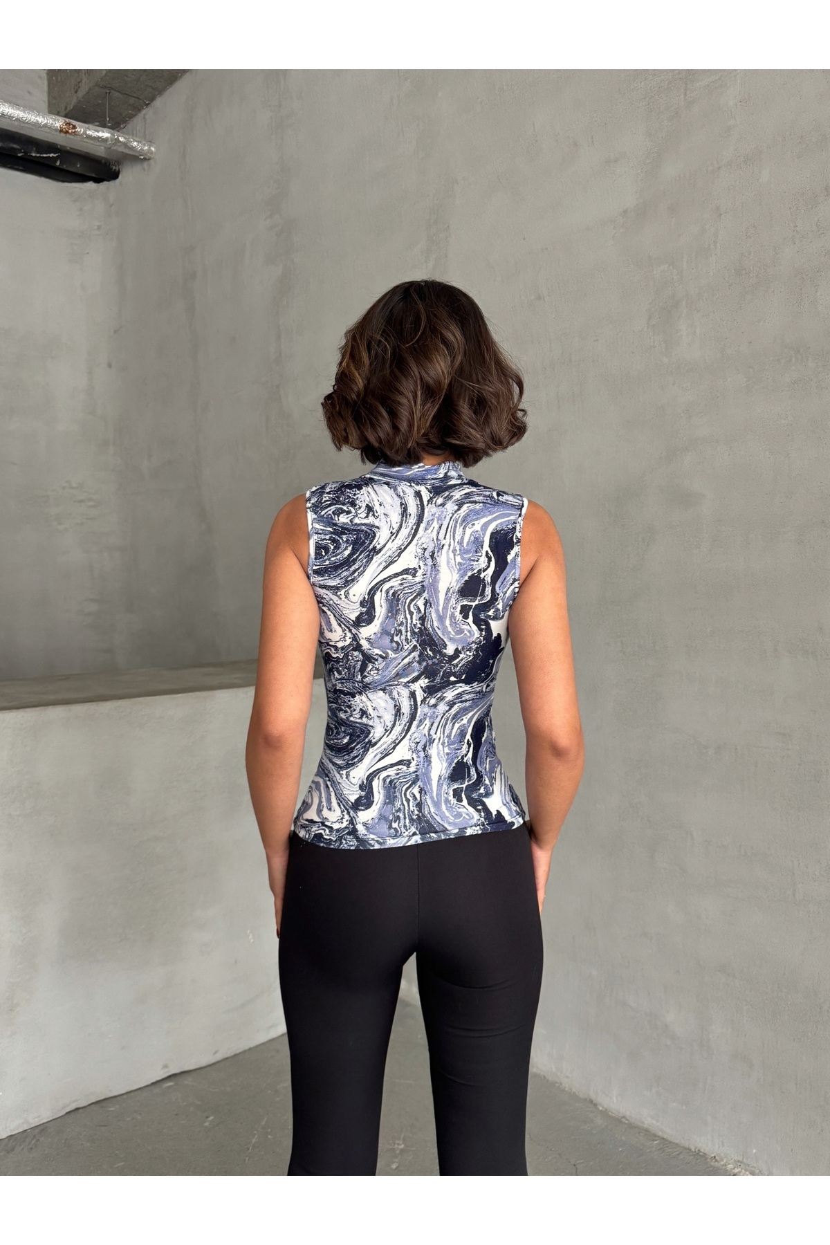 Kadın Lacivert Krema Desen Dik Yaka Sıfır Kollu Viskon Bluz Kadın Lacivert Krema Desen Dik Yaka Sıfır Kollu Viskon Bluz MR-1176 L