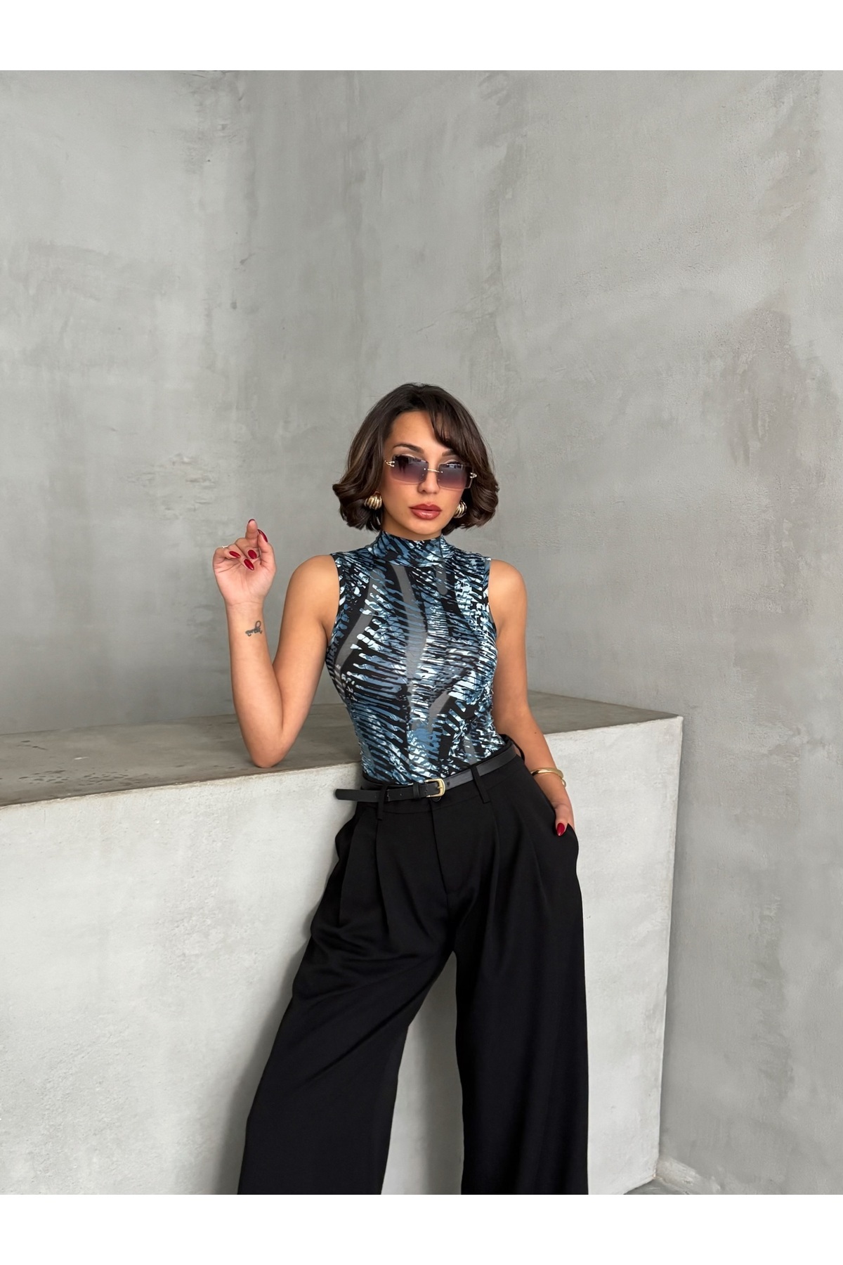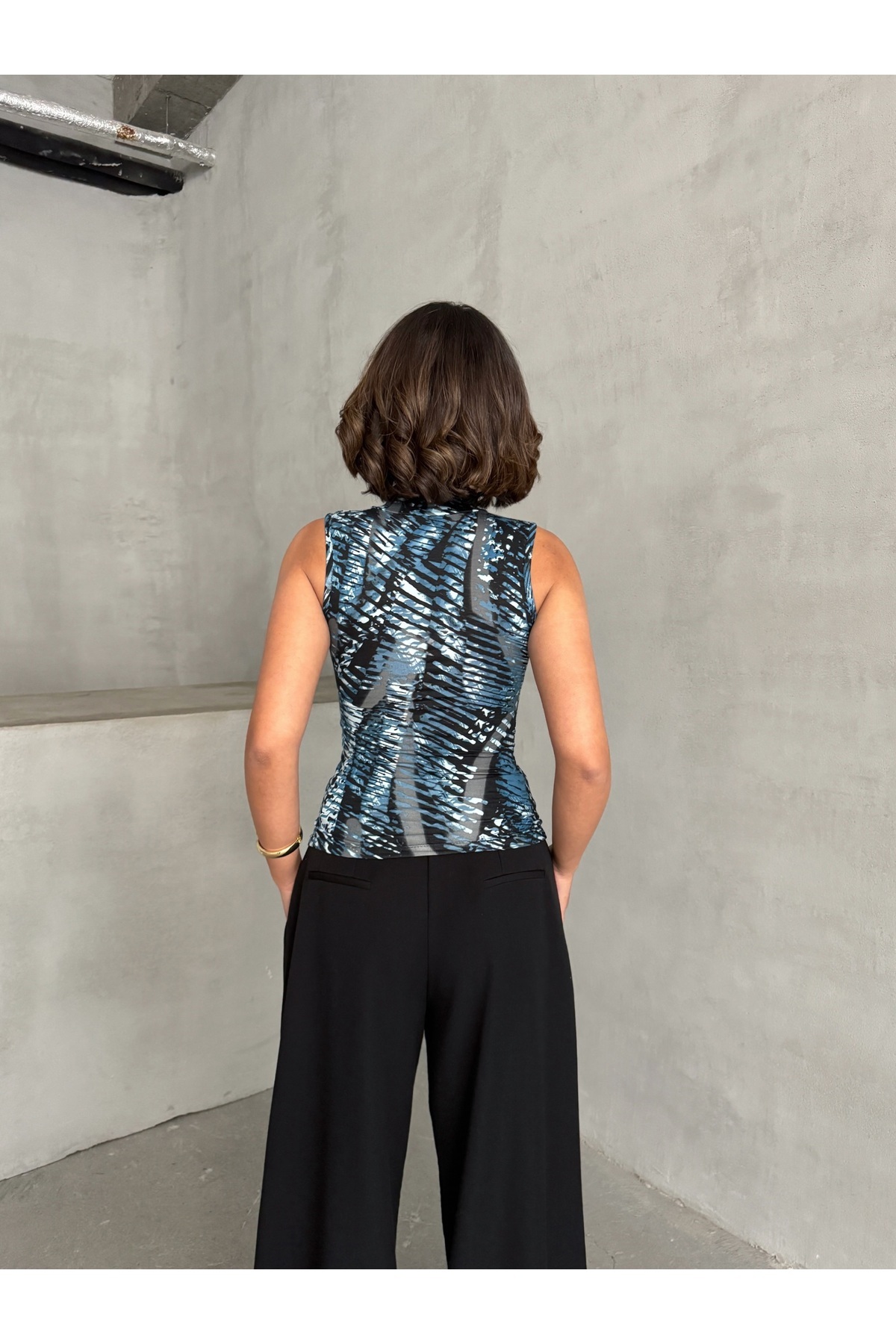 Kadın Mavi Siyah Desenli Dik Yaka Sıfır Kollu Viskon Bluz Kadın Mavi Siyah Desenli Dik Yaka Sıfır Kollu Viskon Bluz MR-1176 L