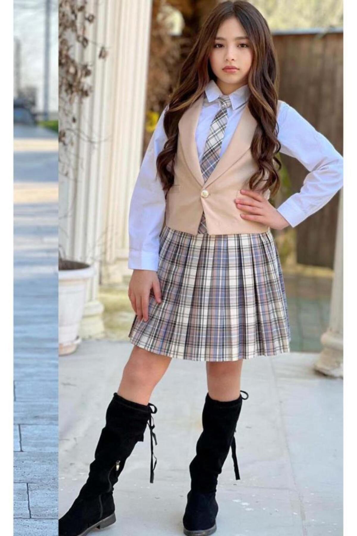 Kız Çocuk Gümüş Düğme Detaylı Krem Yelek Gabardin Gömlek Kravatlı Ekose Çizgili Etekli Takım Kız Çocuk Gümüş Düğme Detaylı Krem Yelek Gabardin Gömlek Kravatlı Ekose Çizgili Etekli Takım 2251804019 2-3