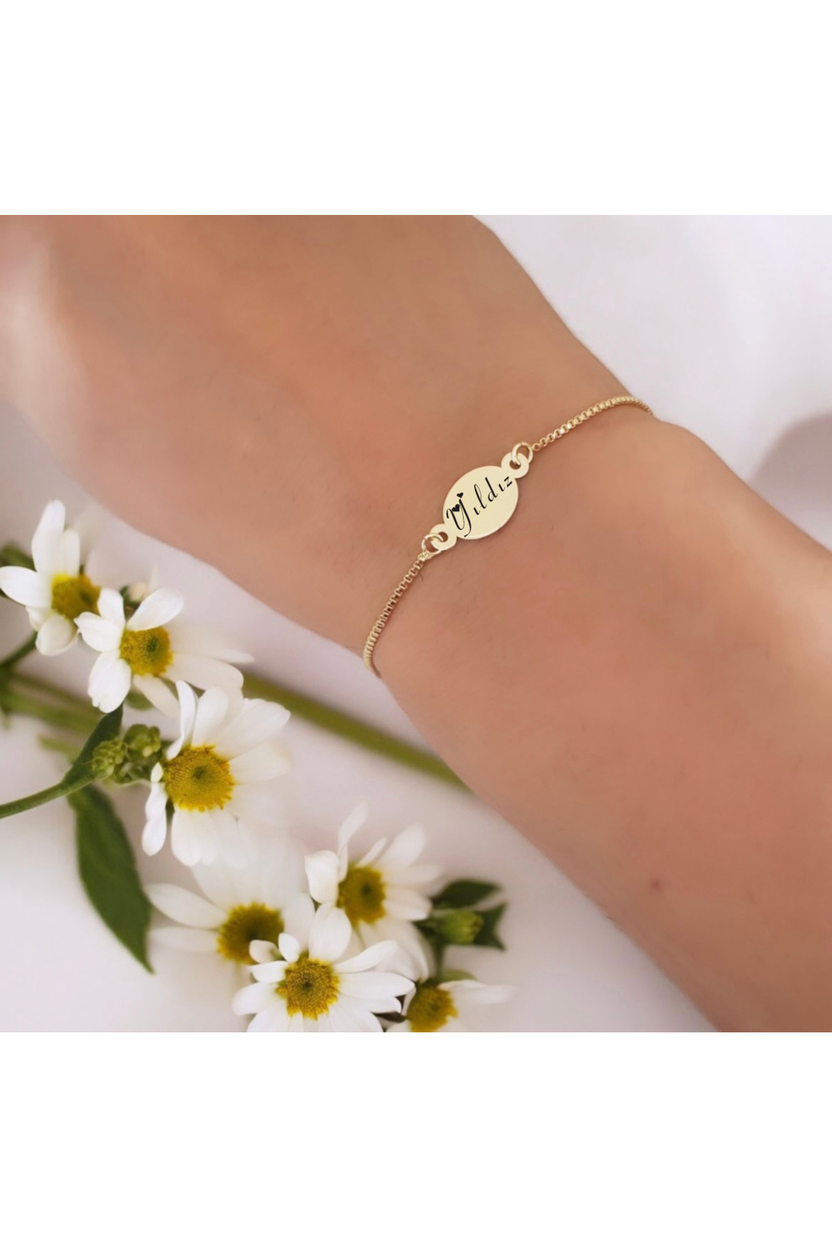 مشخصات فنی 14 Ayar Altın Plakalı Oval Motifli Bayanlara Özel Zincirli Isim Bilekliği-399isim-altın