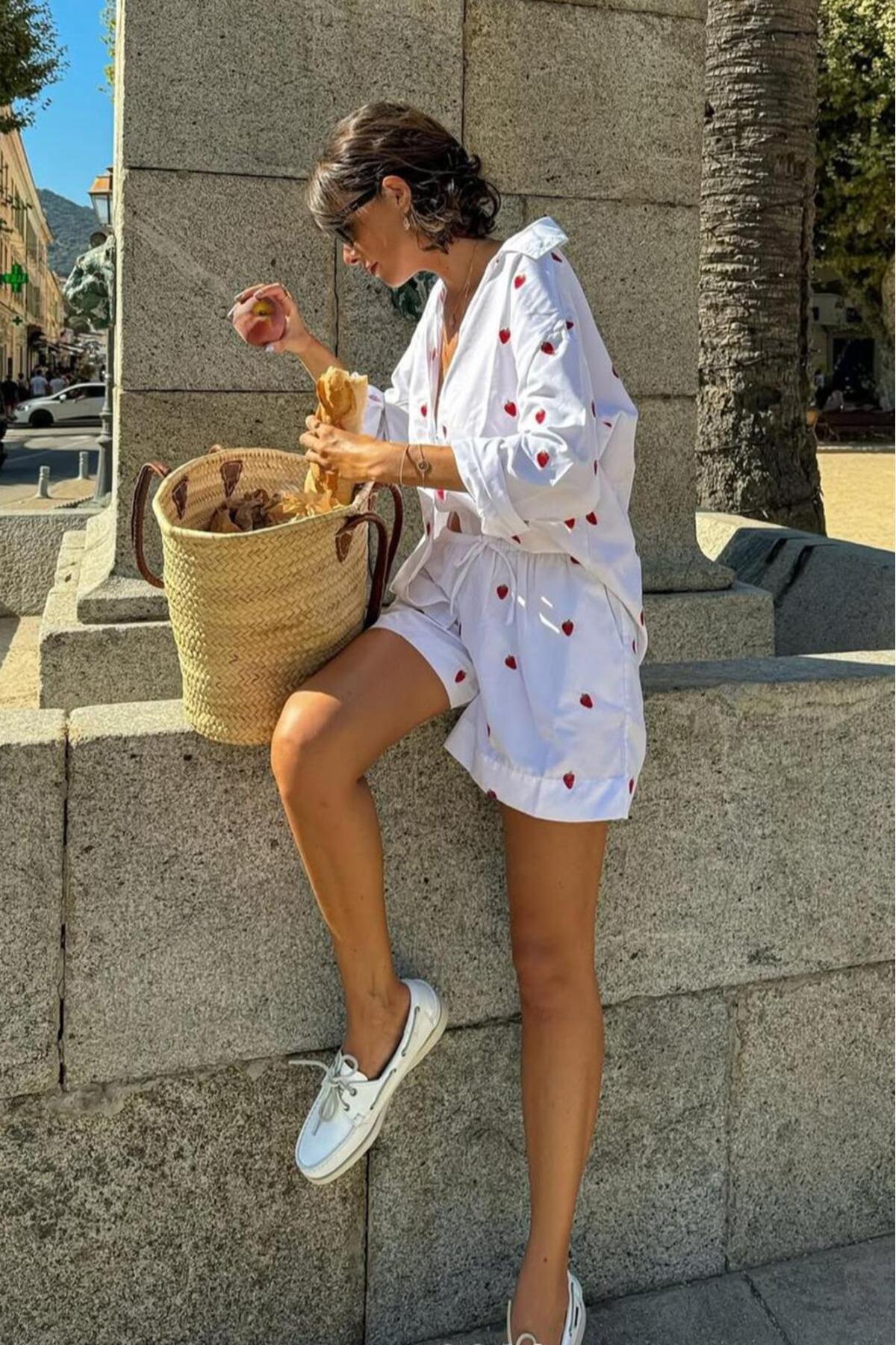 Beyaz Çilek Desenli Kadın Şort Gömlek Takım MG2406 Beyaz Çilek Desenli Kadın Şort Gömlek Takım MG2406 L