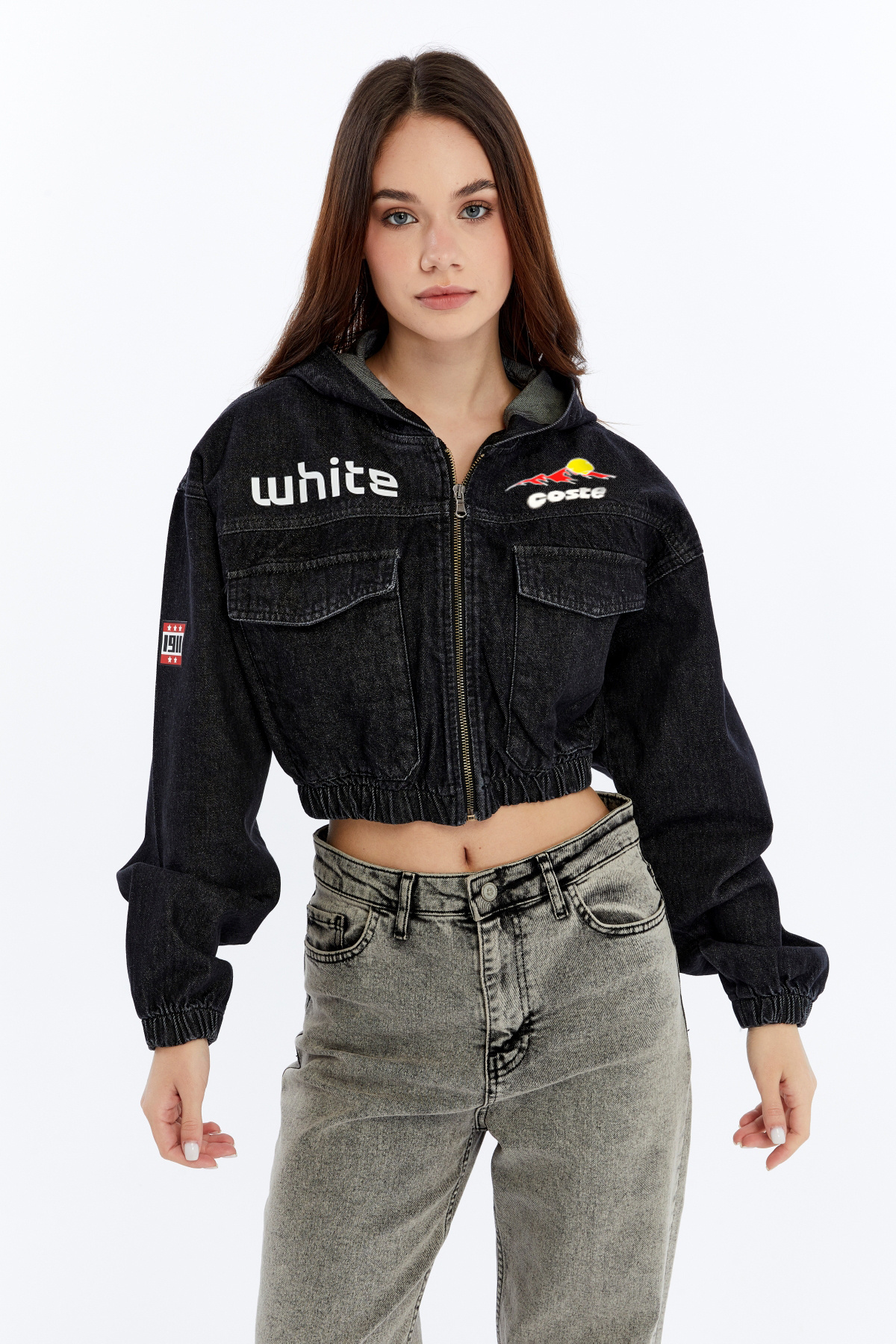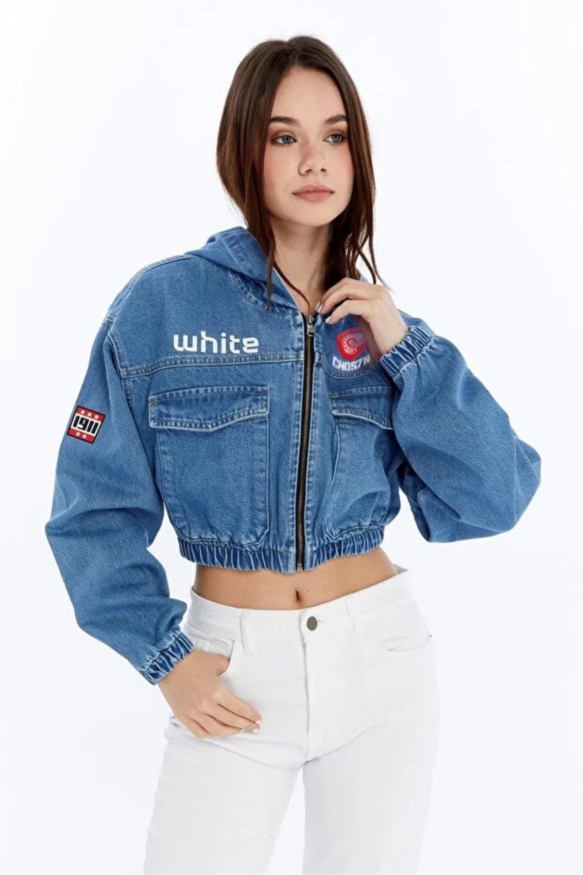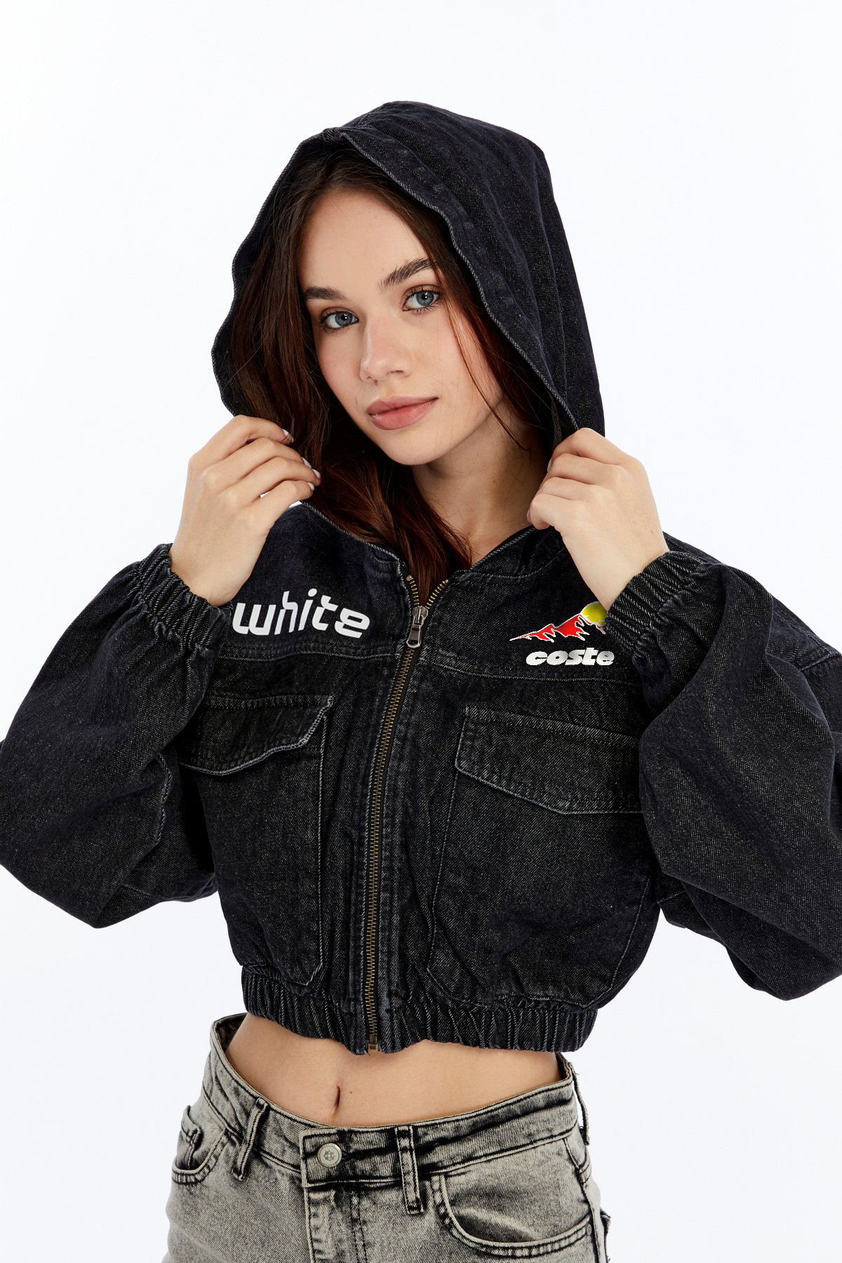 Kadın Baskılı Kapüşonlu Kot Ceket Ön Büyük İki Cep Bel Ve Kol Lastikli Bomber Mont Ceket Kadın Baskılı Kapüşonlu Kot Ceket Ön Büyük İki Cep Bel Ve Kol Lastikli Bomber Mont Ceket TKU-KOT L
