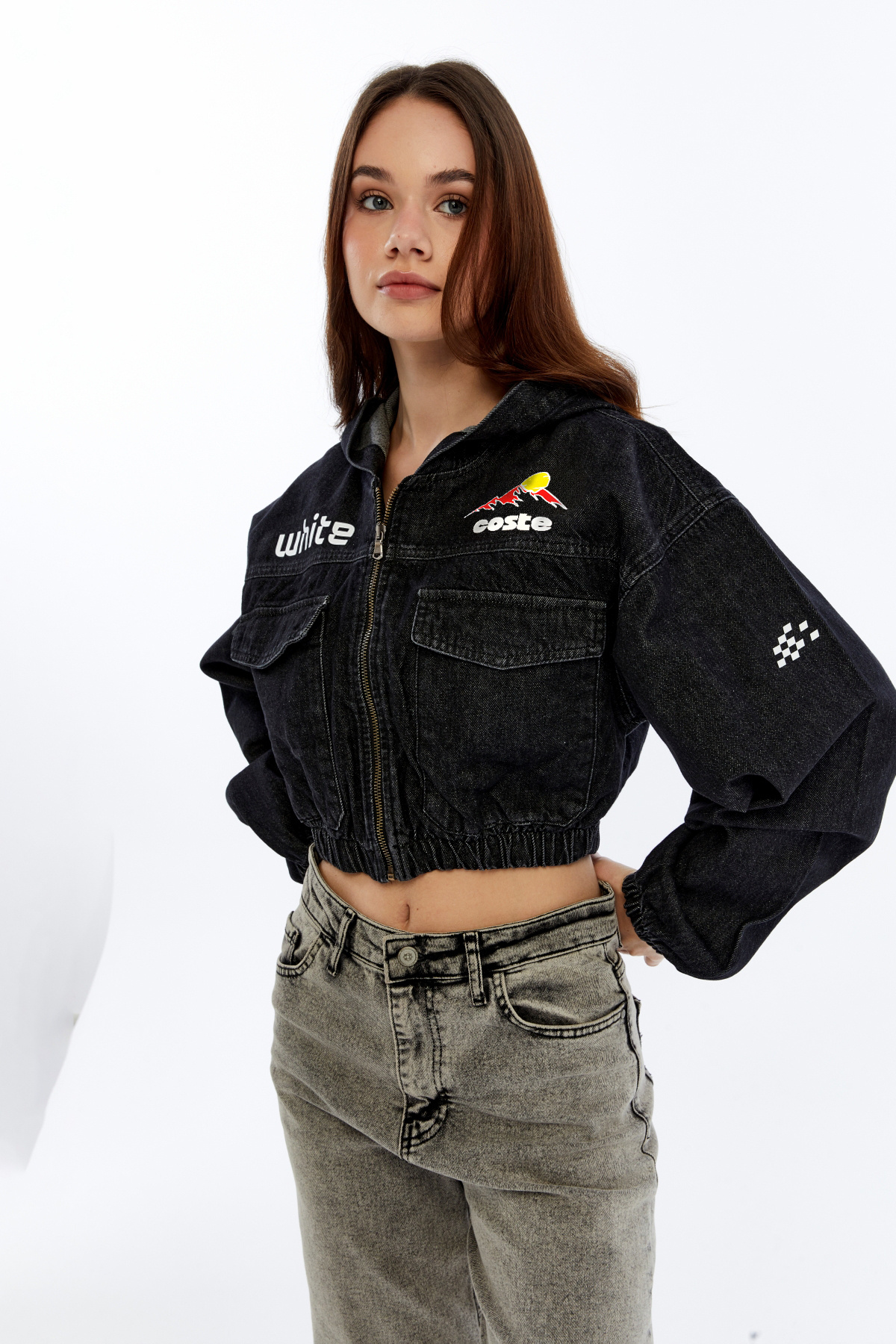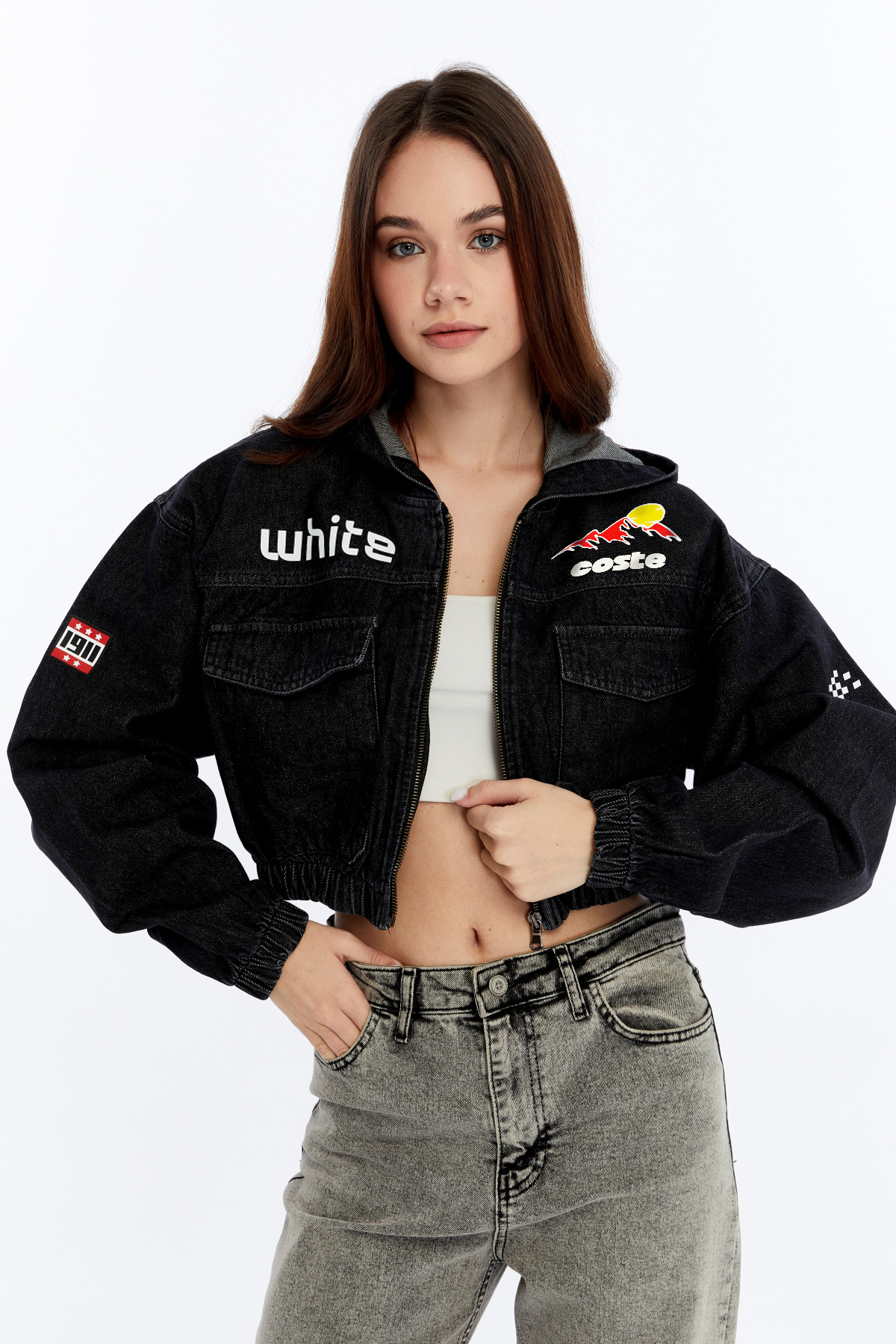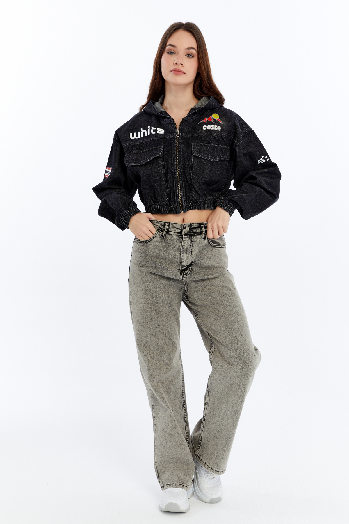 Kadın Baskılı Kapüşonlu Kot Ceket Ön Büyük İki Cep Bel Ve Kol Lastikli Bomber Mont Ceket Kadın Baskılı Kapüşonlu Kot Ceket Ön Büyük İki Cep Bel Ve Kol Lastikli Bomber Mont Ceket TKU-KOT L