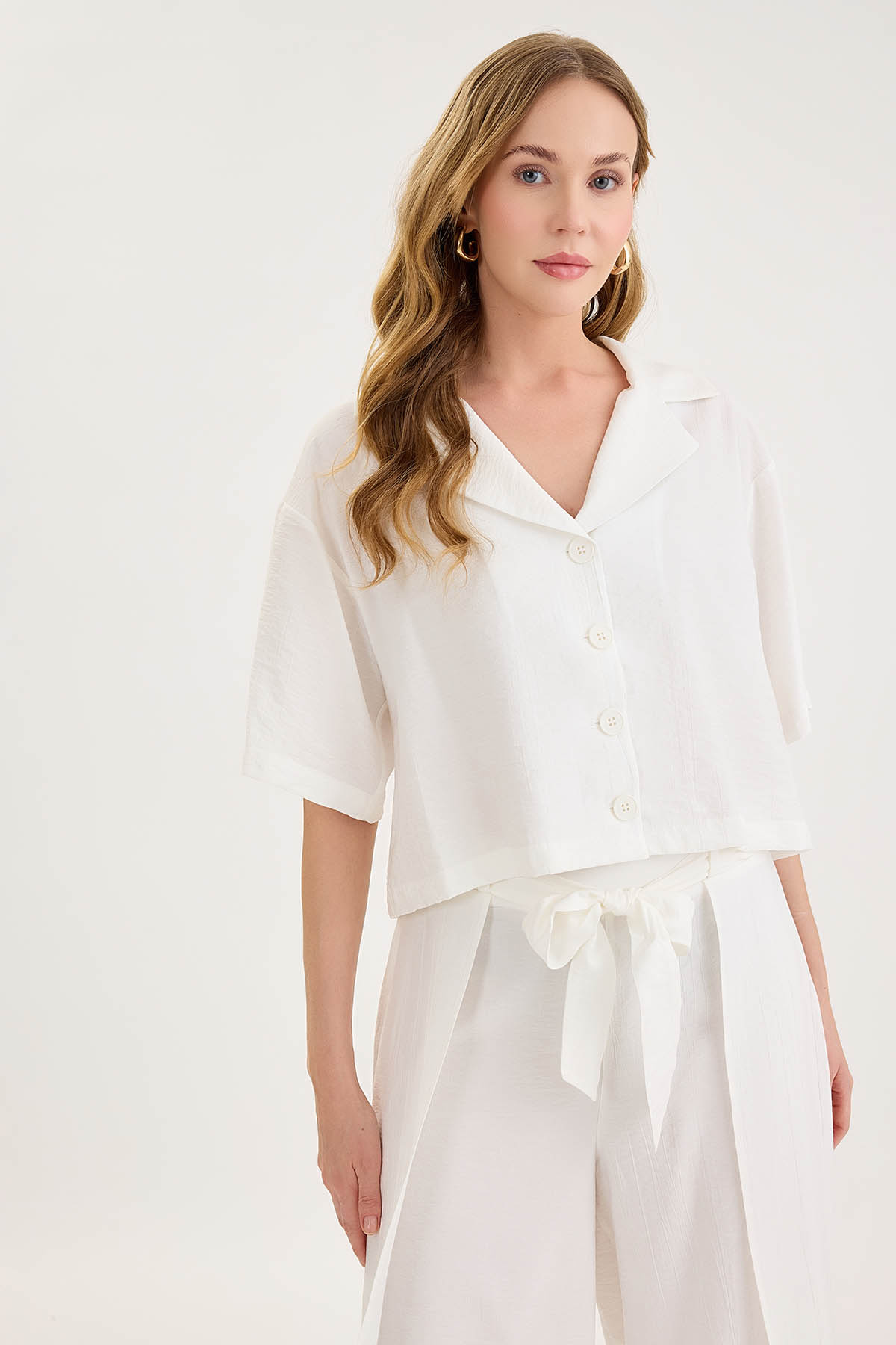 Krinkıl Kumaş Kısa Kol Crop Gömlek Krinkıl Kumaş Kısa Kol Crop Gömlek 25-387 L