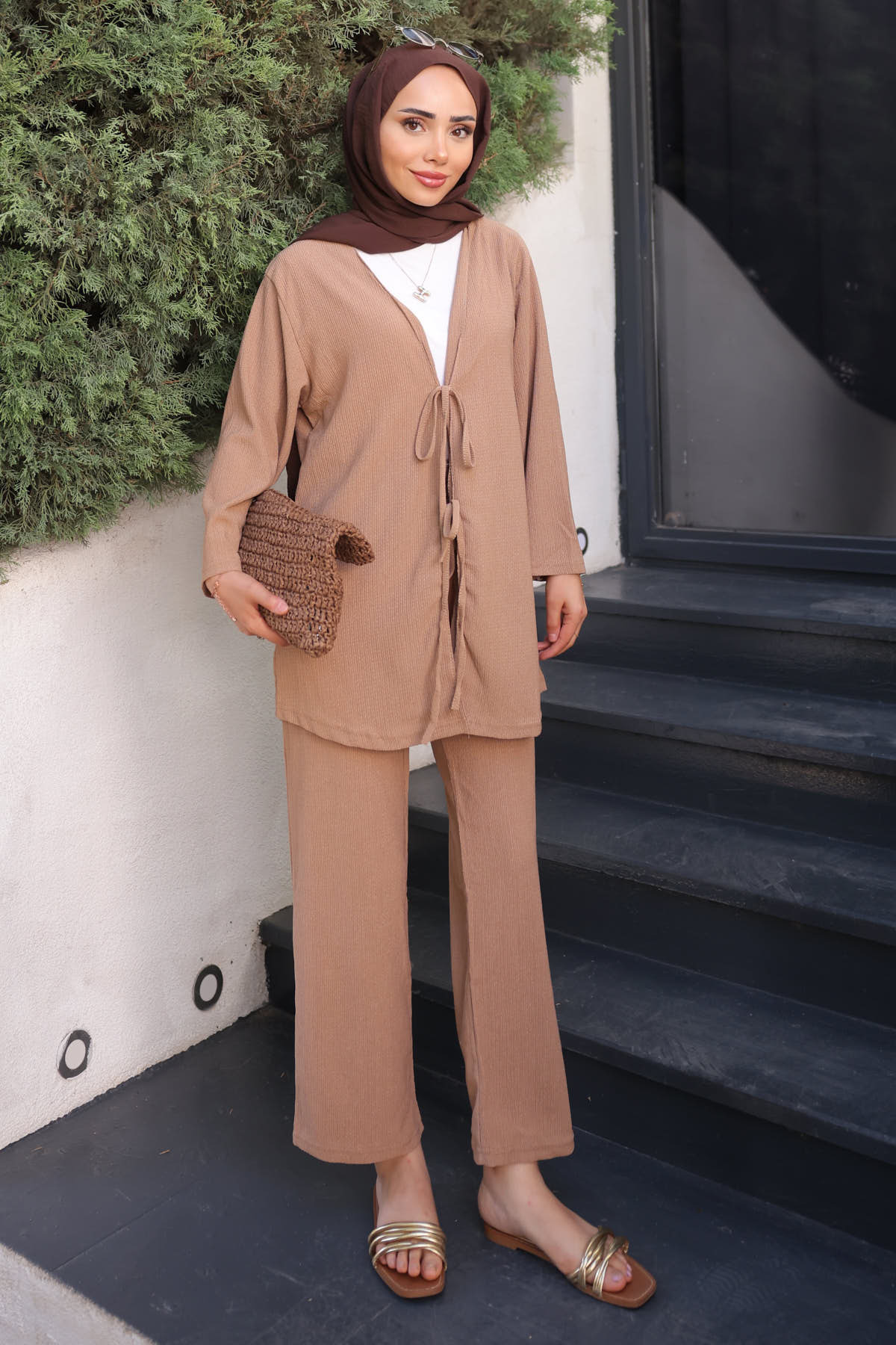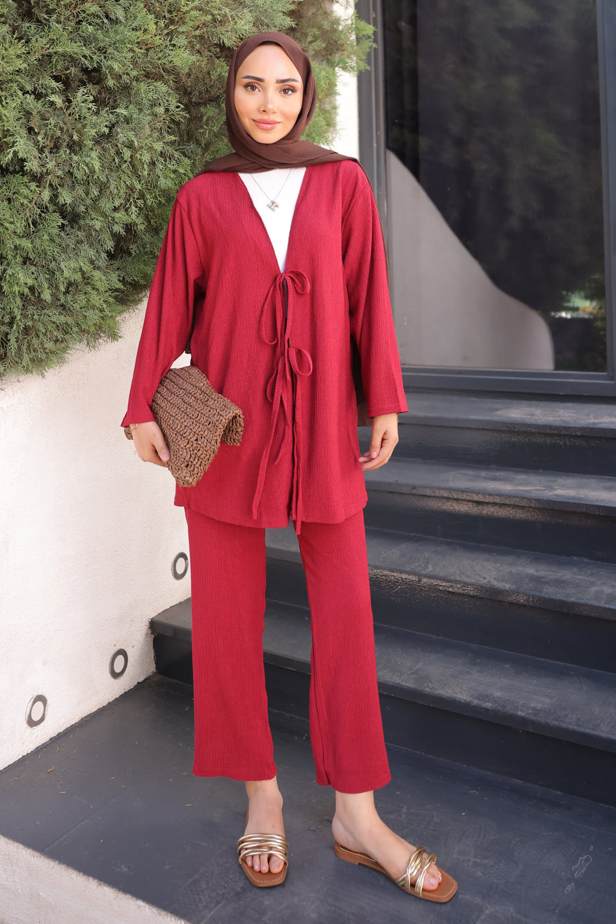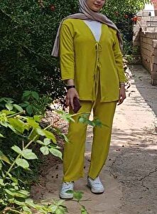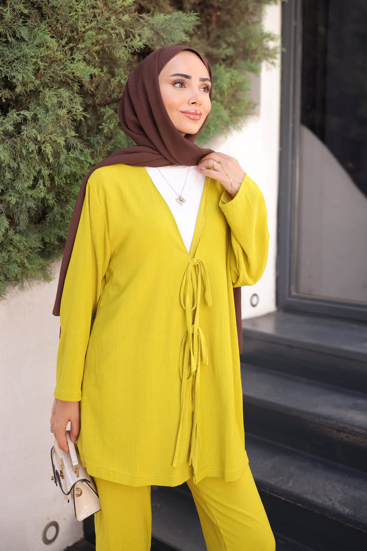 Yağ Yeşili Ön Bağlamalı Bürümcük Kimono Pantolonlu Takım Yağ Yeşili Ön Bağlamalı Bürümcük Kimono Pantolonlu Takım IMJ006356 2XL