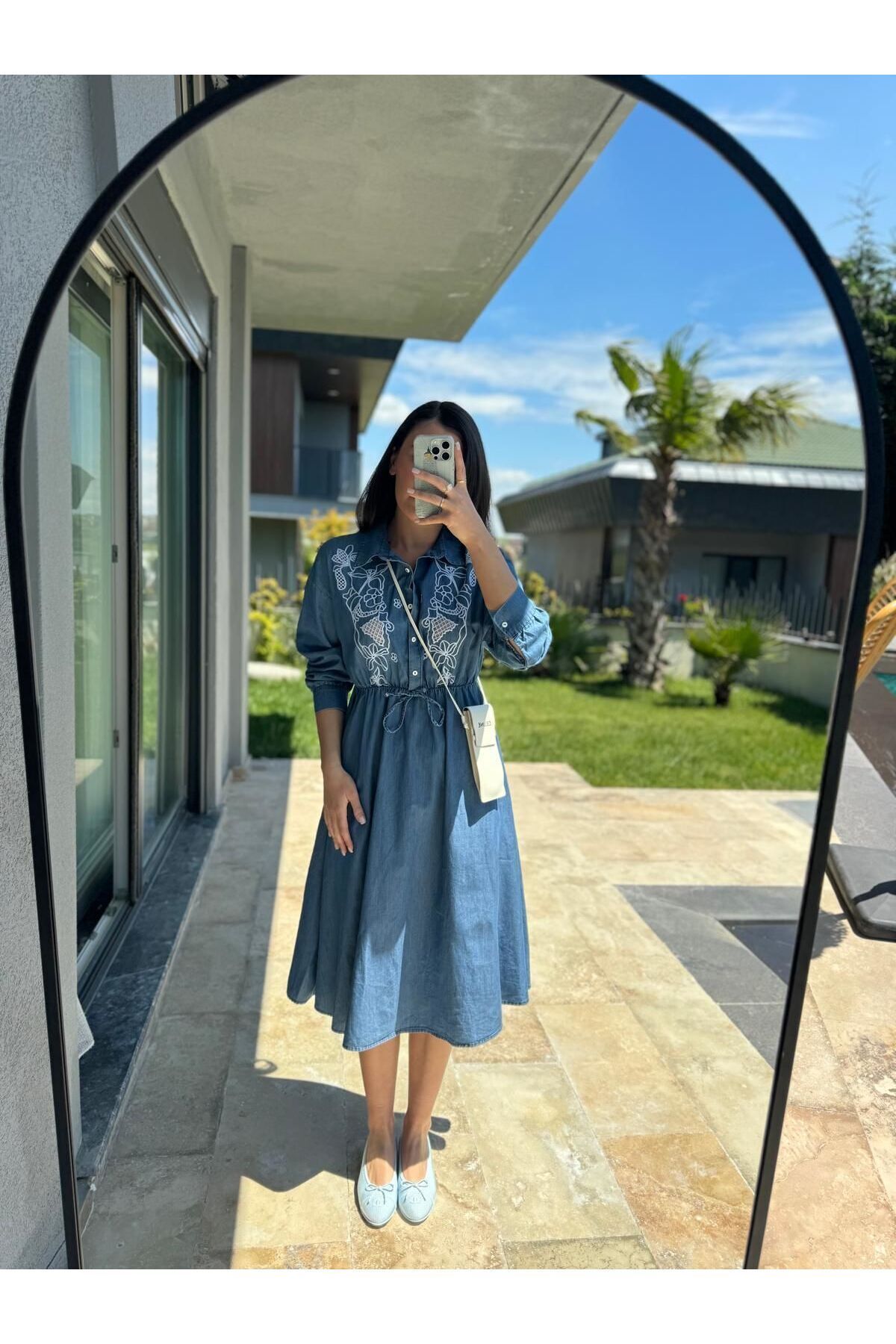 Kadın Mavi Denim V Yaka %100 Pamuk Önü Düğmeli Prenses Kol Midi Boy Cepli Kloş Jean Kot Elbise Kadın Mavi Denim V Yaka %100 Pamuk Önü Düğmeli Prenses Kol Midi Boy Cepli Kloş Jean Kot Elbise ab-klosdenim L