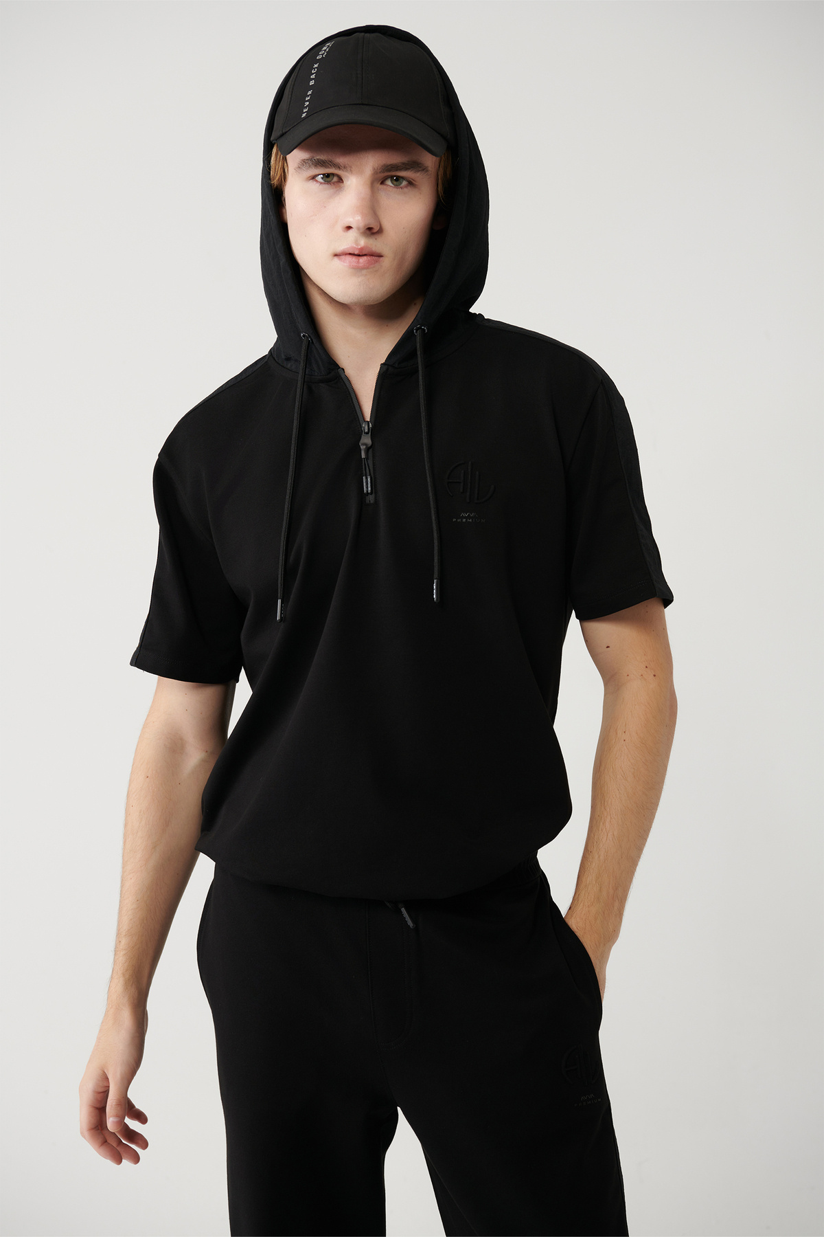 Erkek Siyah Kapşonlu Kısa Kollu Oval Slimfit Tshirt Erkek Siyah Kapşonlu Kısa Kollu Oval Slimfit Tshirt no601kolsuzatleterkek XL