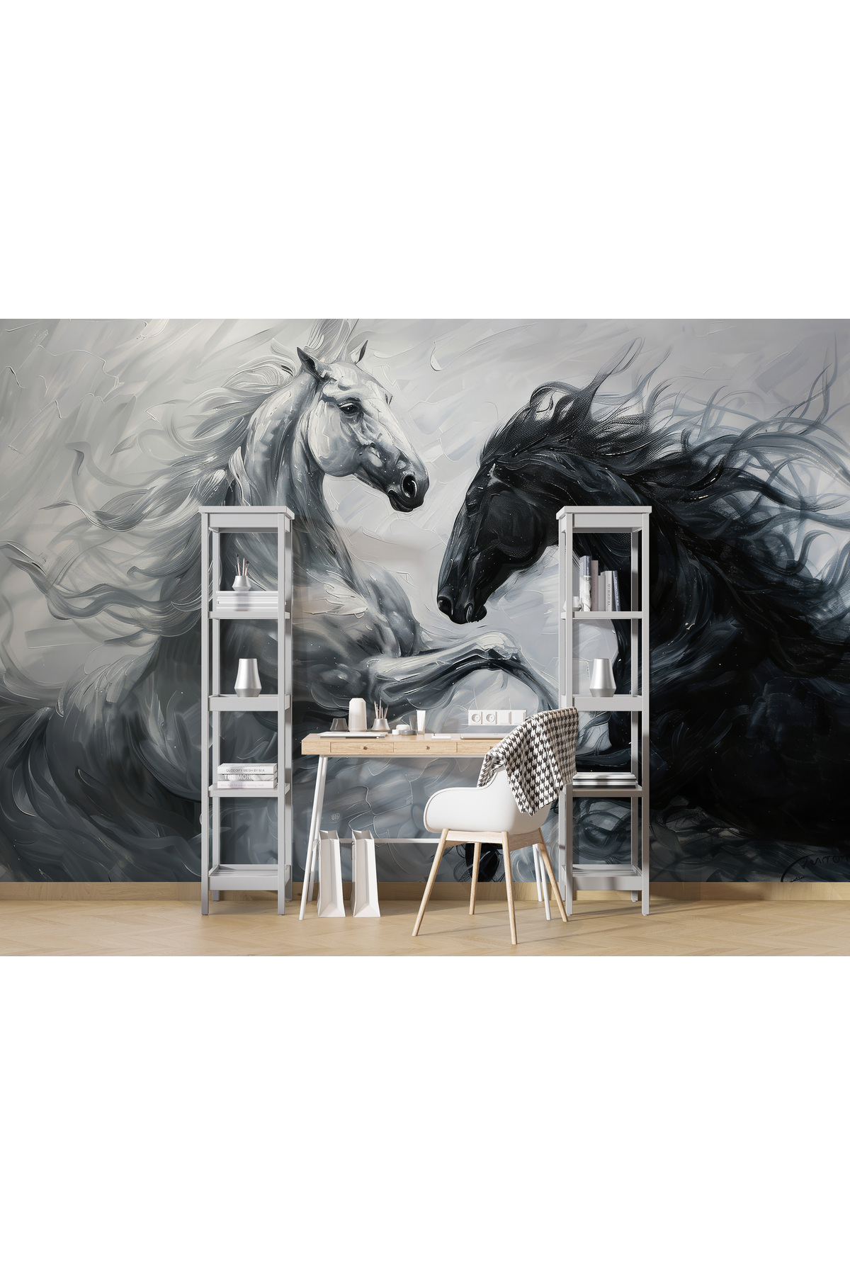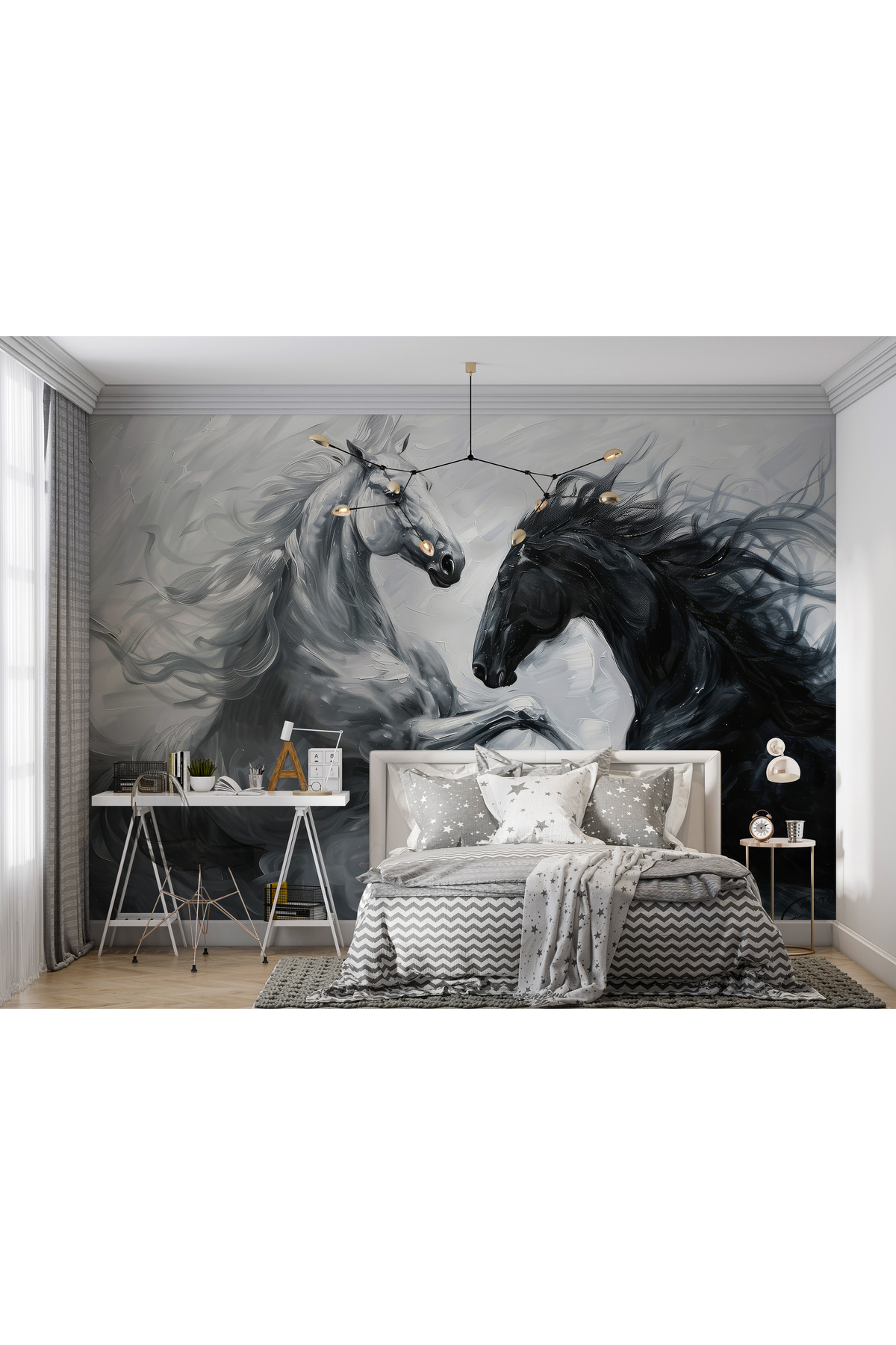 Siyah ve Beyaz At Temalı Sanatsal Kendinden Yapışkanlı Duvar Kağıdı, Kendin Yap Duvar Kağıdı Siyah ve Beyaz At Temalı Sanatsal Kendinden Yapışkanlı Duvar Kağıdı, Kendin Yap Duvar Kağıdı DK05C57P 208 x 250