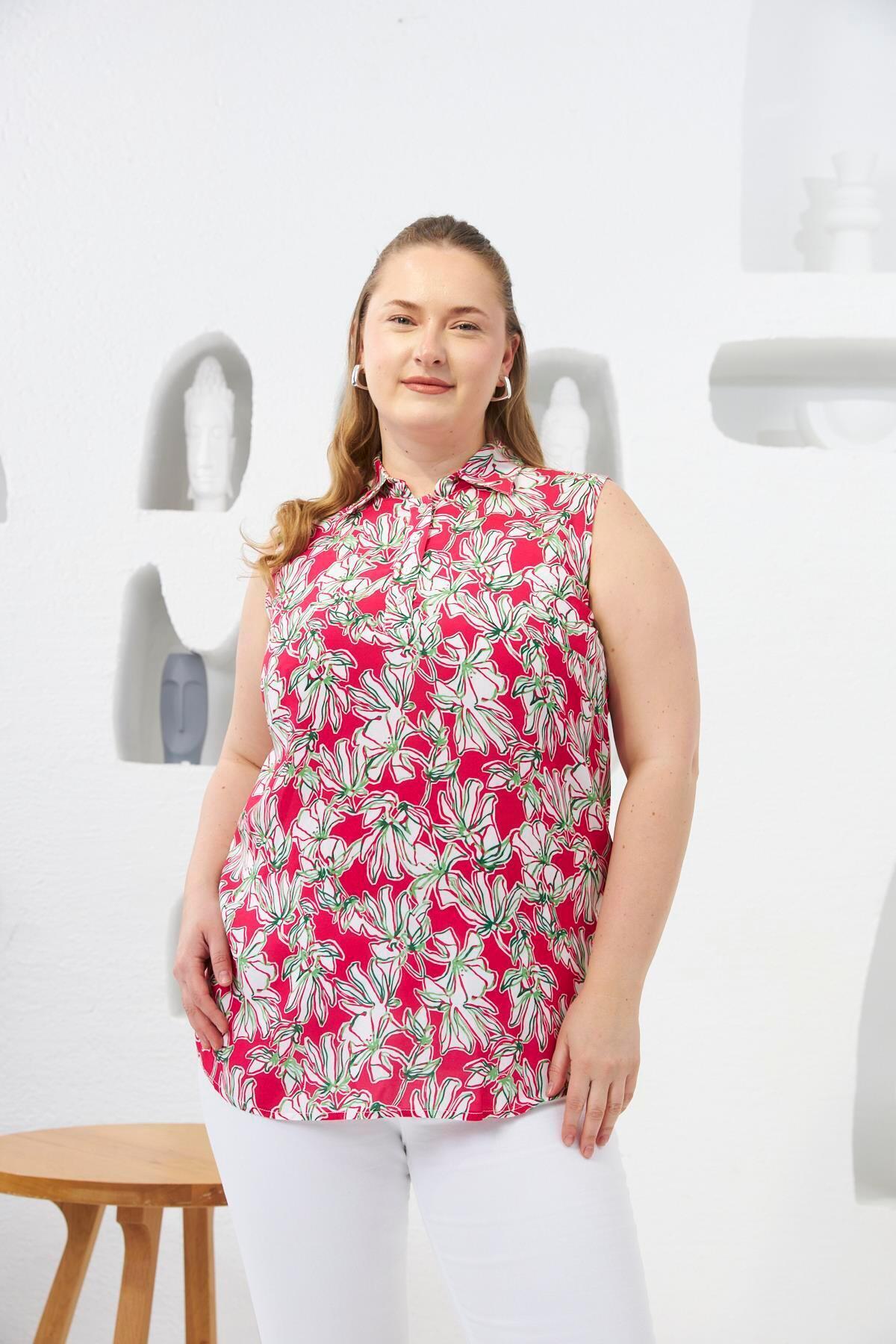 Gömlek Yaka Desenli Sıfır Kol Büyük Beden Bluz Yeşil Gömlek Yaka Desenli Sıfır Kol Büyük Beden Bluz Yeşil O6712 50