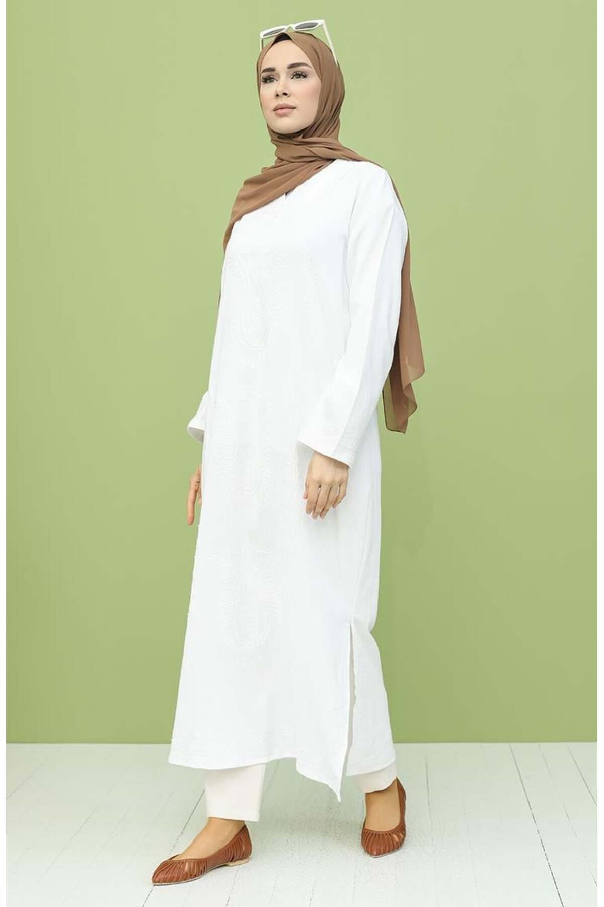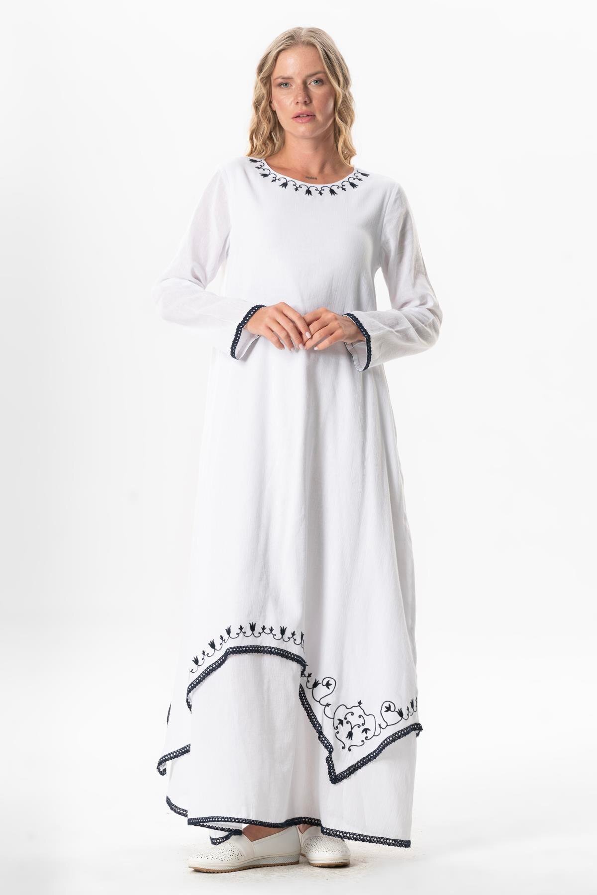 Uzun Kol Şile Bezi Simli Kaftan Midi Boy Yazlık Elbise Beyaz Byz Uzun Kol Şile Bezi Simli Kaftan Midi Boy Yazlık Elbise Beyaz Byz 222.02 2XL