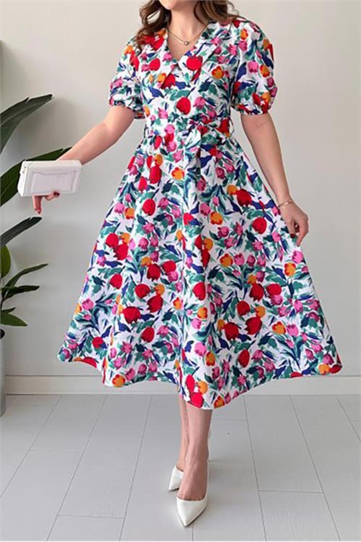 Kuşaklı poplin kumaş Çiçek desenli elbise DPMY3467 Kuşaklı poplin kumaş Çiçek desenli elbise DPMY3467