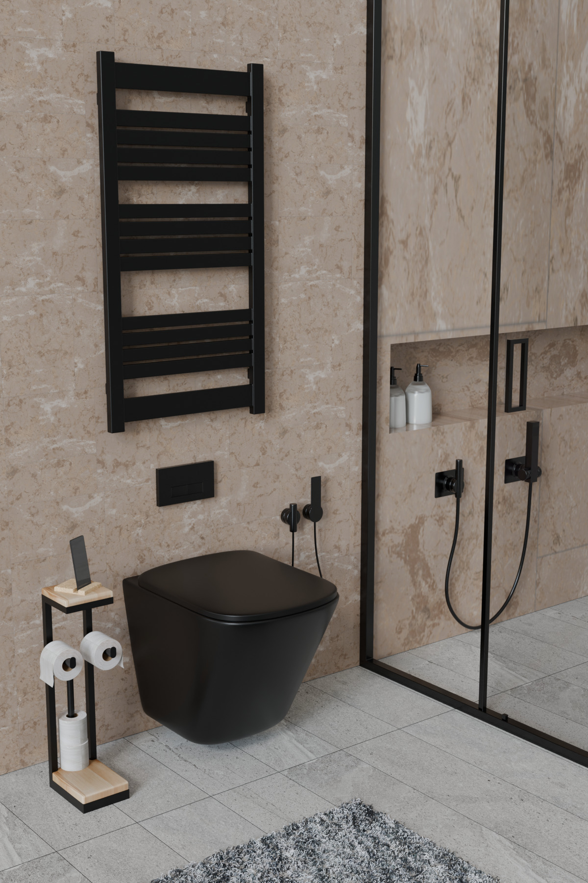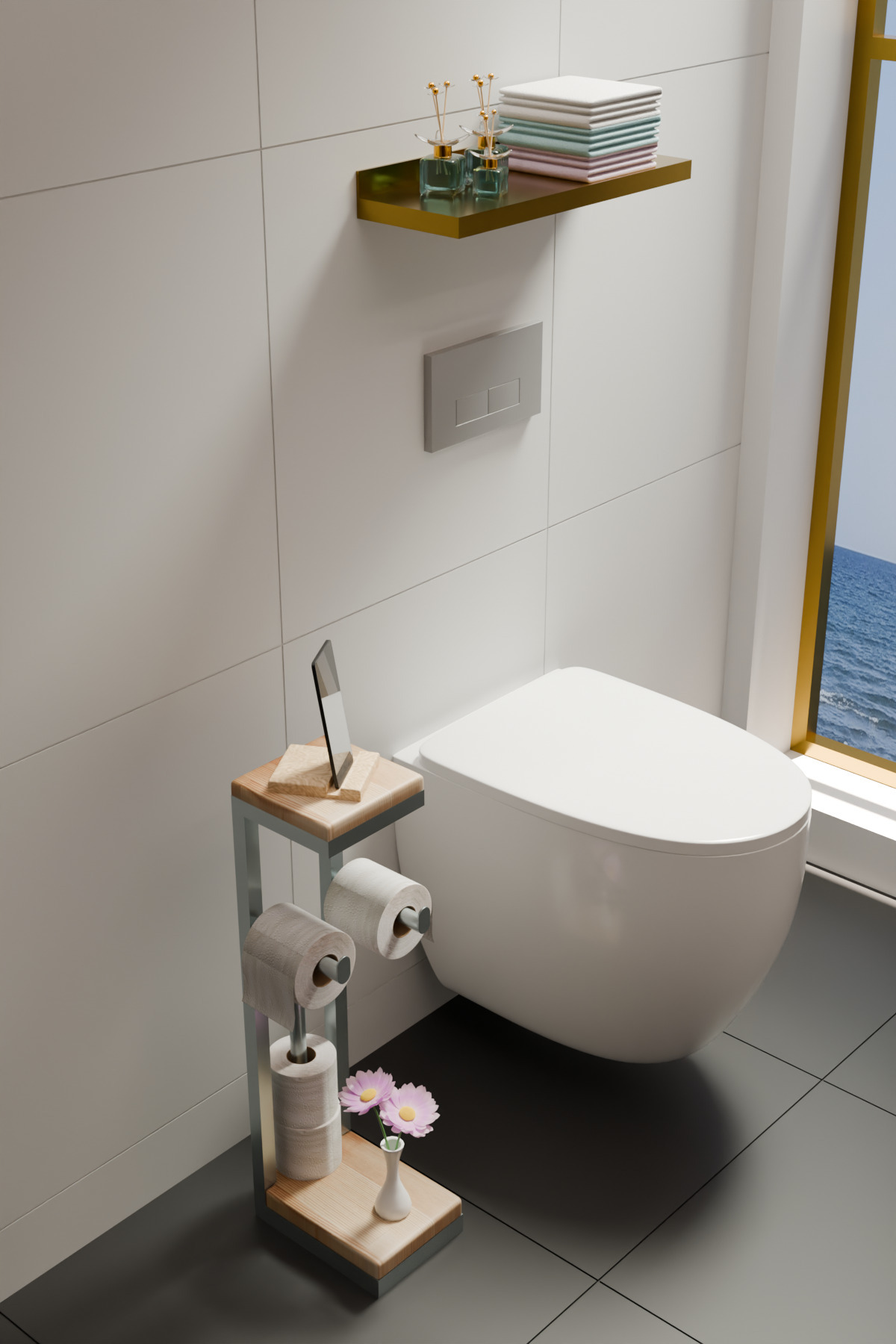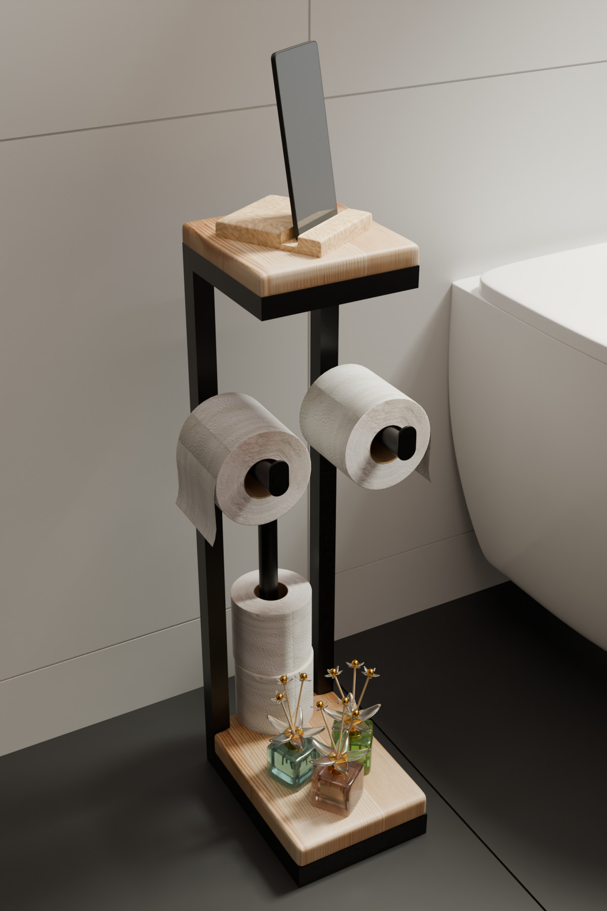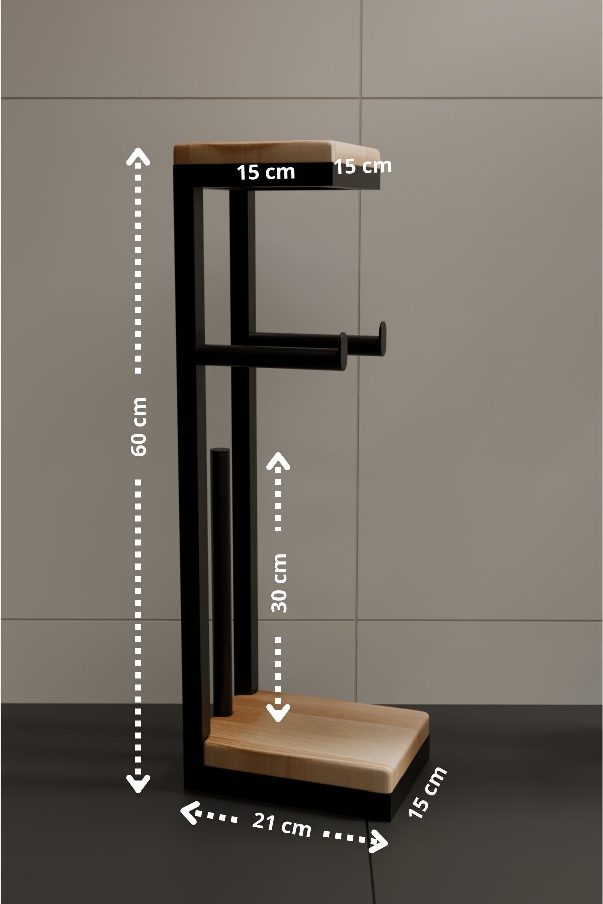 Ahşap Detaylı Ayaklı Metal Siyah Tuvalet Kağıtlığı Yedek Bölmeli Şık Tasarım tk-003