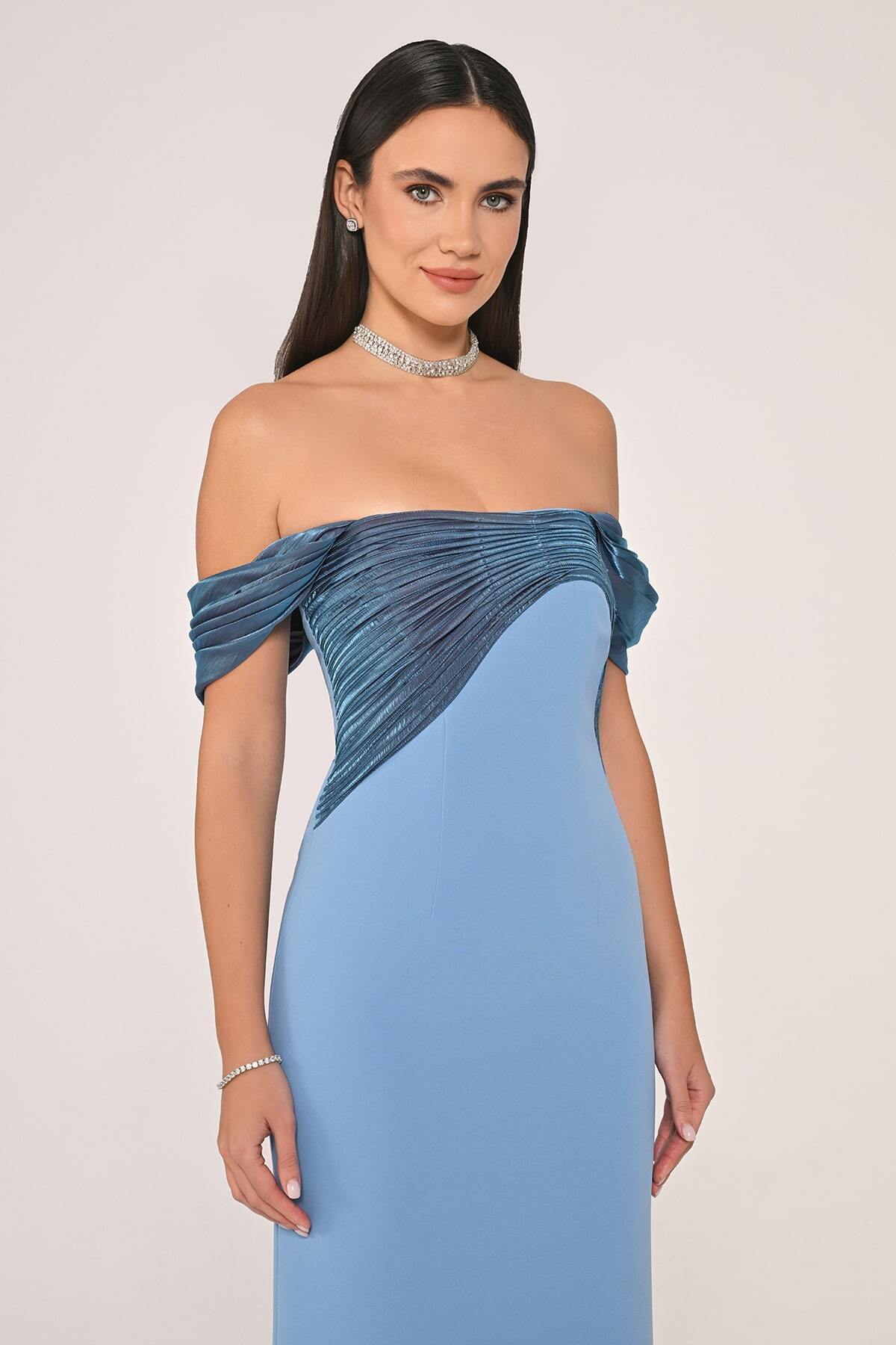 KADIN DÜŞÜK OMUZ SATEN YAKA KREP ŞIK UZUN ELBİSE KADIN DÜŞÜK OMUZ SATEN YAKA KREP ŞIK UZUN ELBİSE 6890 44