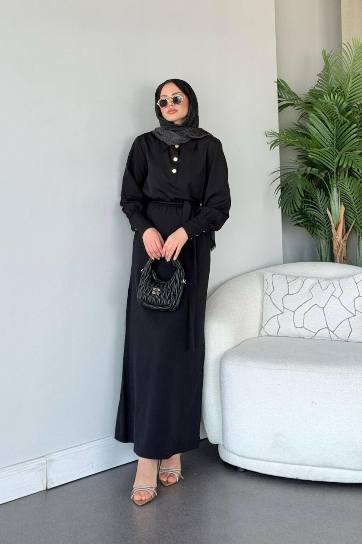 Gold Detaylı Krep Elbise Siyah Gold Detaylı Krep Elbise Siyah 1319 XL
