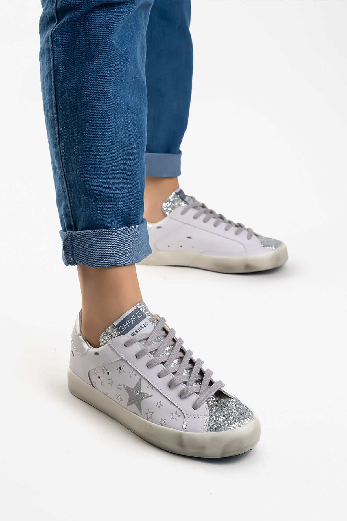 Kadın Beyaz Gümüş Yıldız Logolu Spor Ayakkabı Sneaker Kadın Beyaz Gümüş Yıldız Logolu Spor Ayakkabı Sneaker GLG44 40