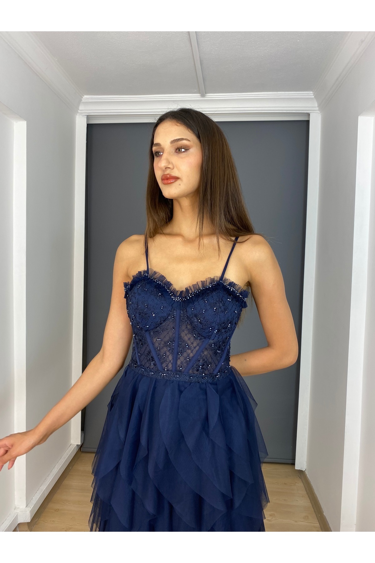 Lacivert Bel Güpür Transparan Detaylı Etek Kat Kat Uzun Abiye Lacivert Bel Güpür Transparan Detaylı Etek Kat Kat Uzun Abiye GAR6400 40
