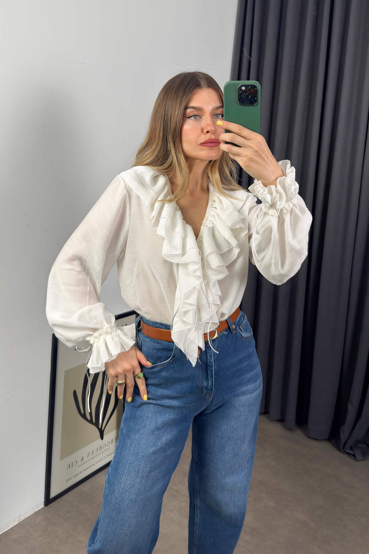 Beyaz Saten İpli Yakası Fırfırlı Oversize Şifon Bluz Beyaz Saten İpli Yakası Fırfırlı Oversize Şifon Bluz BLZ1020 L