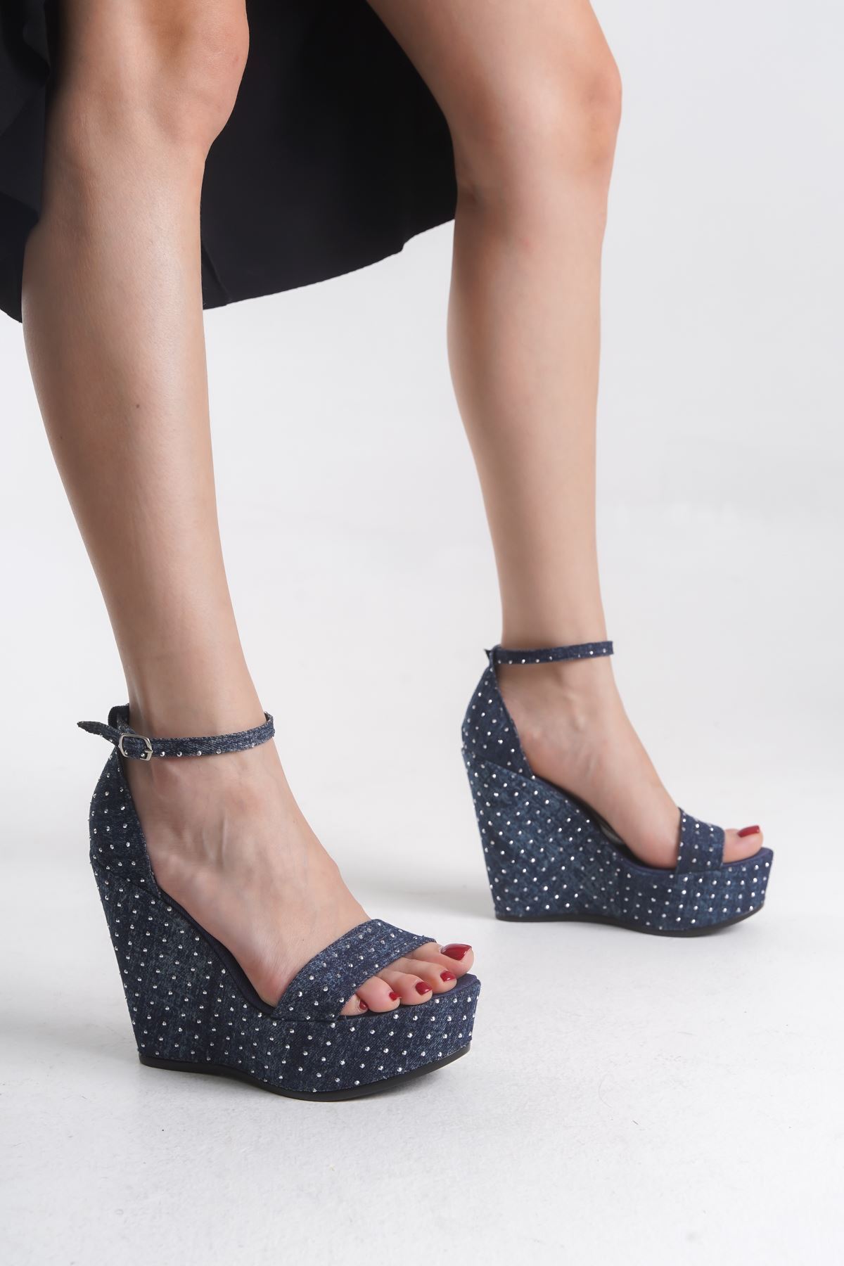 Miranda; Mavi Kot ,Taş Detaylı 12 cm Dolgu Topuklu Ayakkabı Miranda; Mavi Kot ,Taş Detaylı 12 cm Dolgu Topuklu Ayakkabı TCR002MR 40
