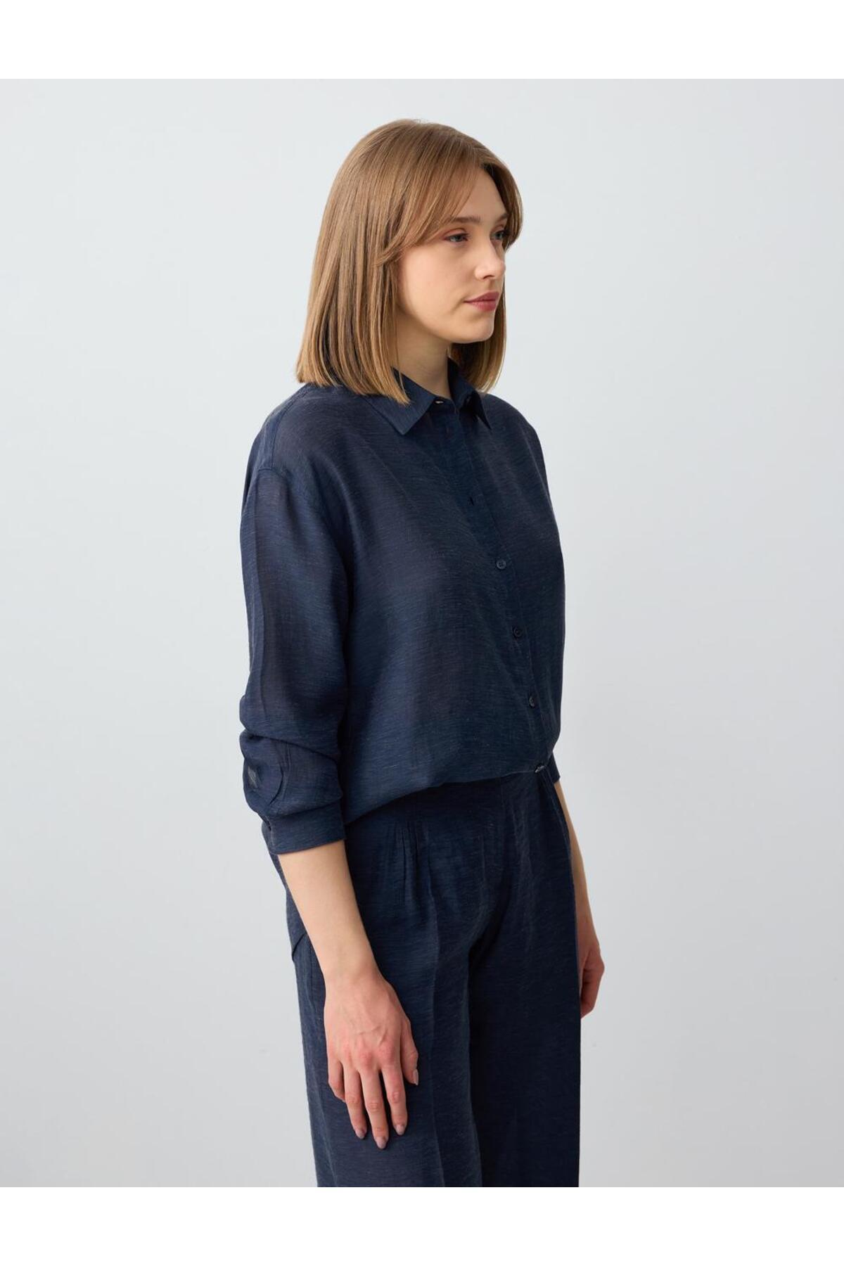 Lacivert Rahat Kesim Uzun Kollu Keten Karışımlı Gömlek Lacivert Rahat Kesim Uzun Kollu Keten Karışımlı Gömlek 5SW082559 XL