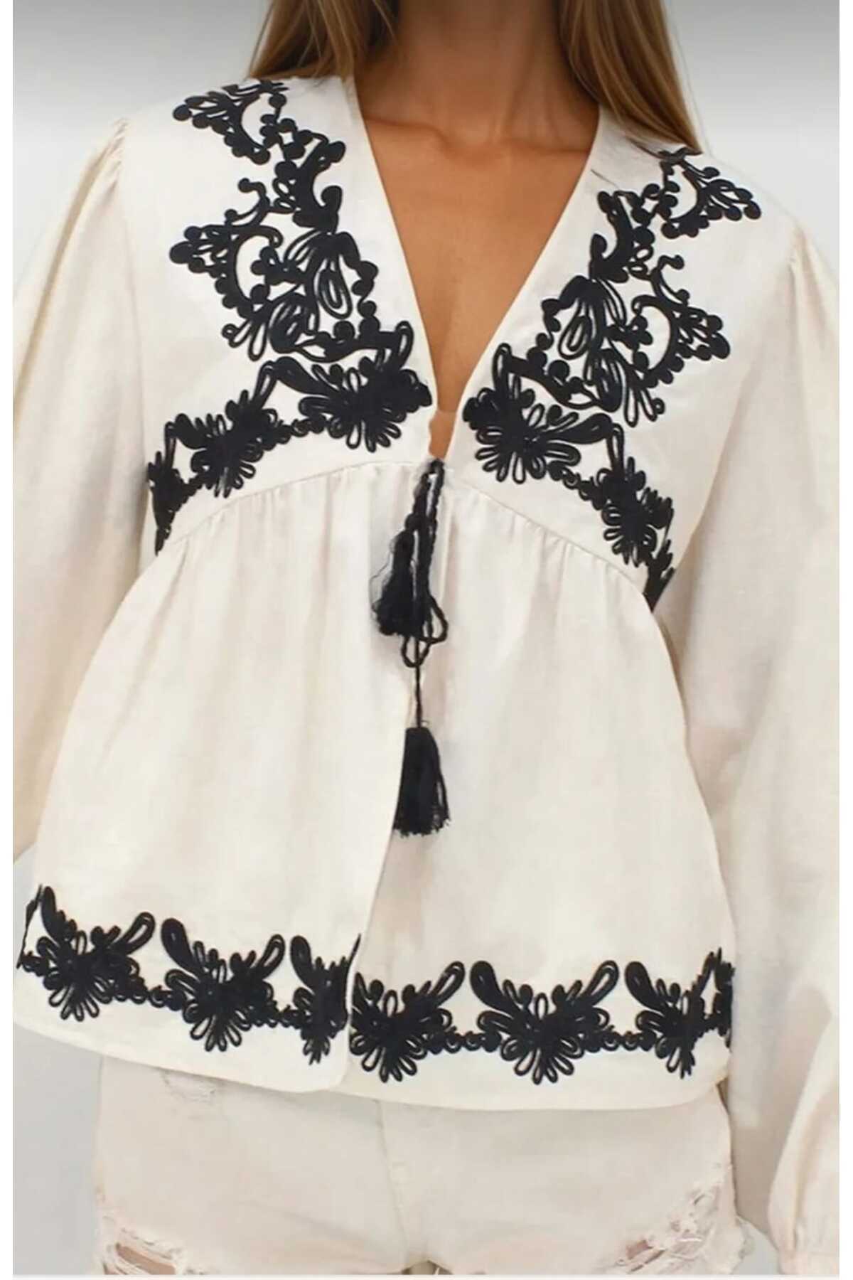 İşleme Detaylı Balon Kol Bağlamalı Ceket İşleme Detaylı Balon Kol Bağlamalı Ceket 25145 L