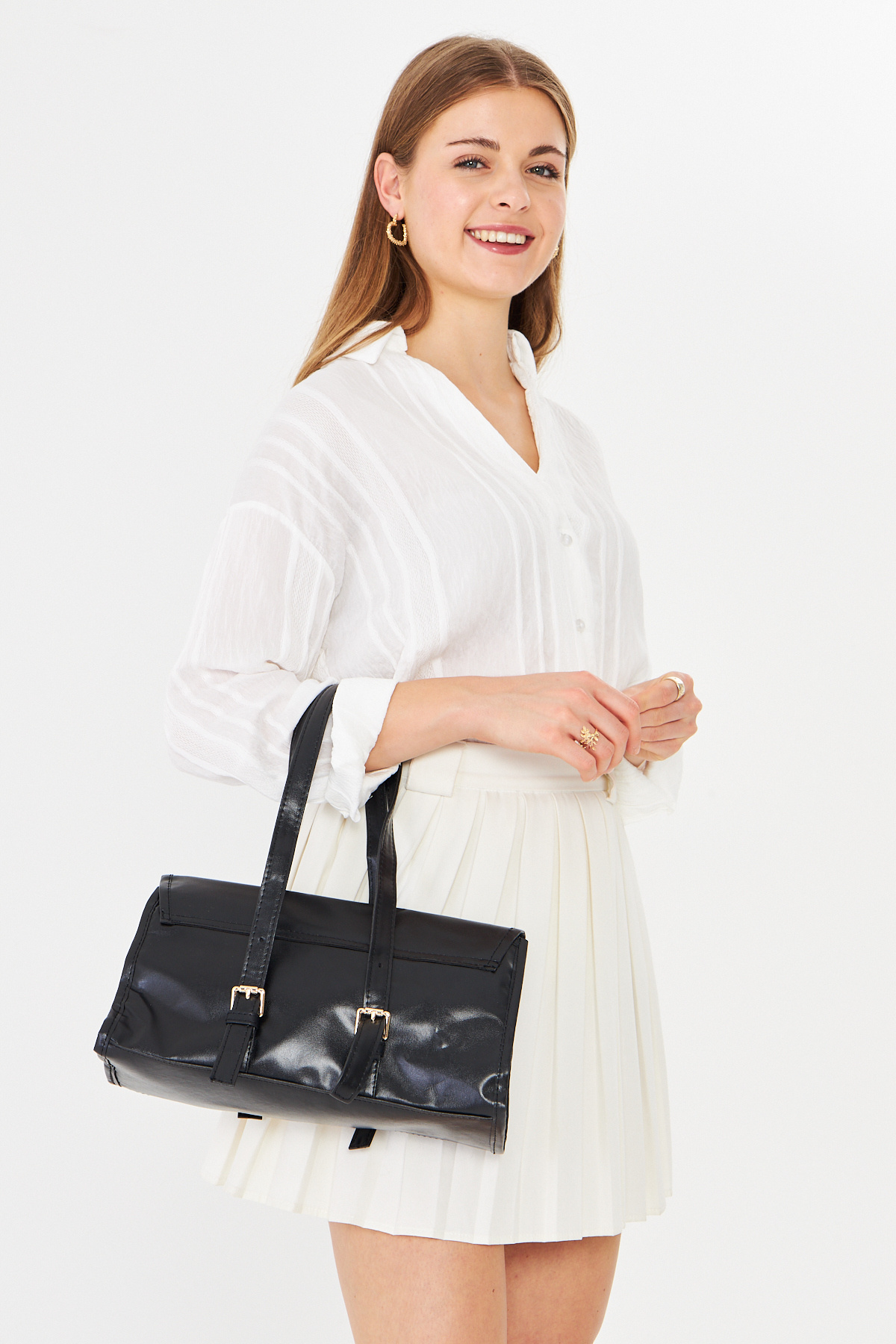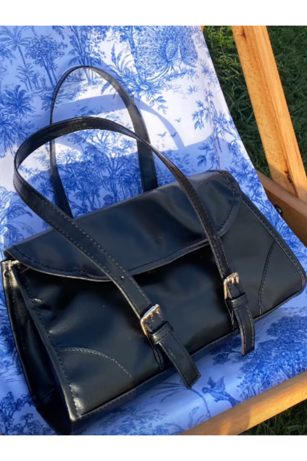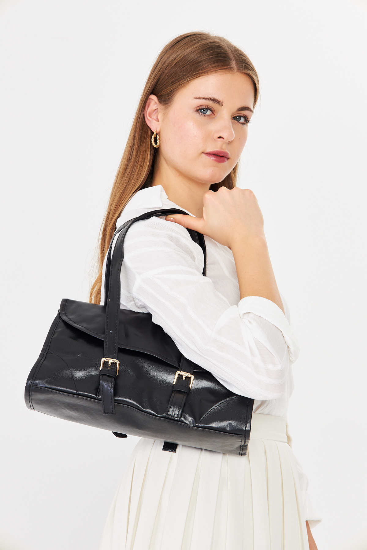 Nima Siyah Vintage Çift Toka Detaylı Lux Baget Çanta Nima Siyah Vintage Çift Toka Detaylı Lux Baget Çanta NM01 تک سایز