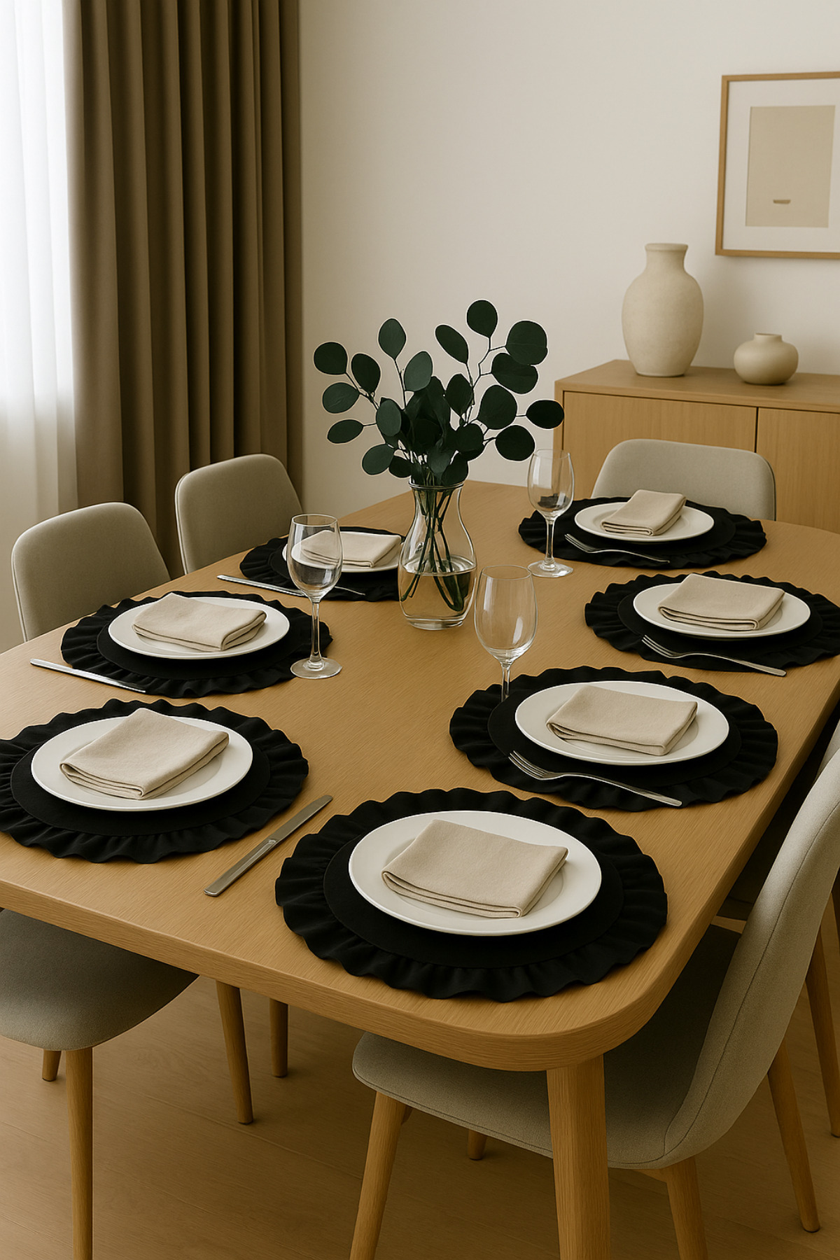 6'lı Amerikan Servisi Yuvarlak Supla Seti - Fırfırlı Pamuk Keten, 40 cm - Siyah Renk 6'lı Amerikan Servisi Yuvarlak Supla Seti - Fırfırlı Pamuk Keten, 40 cm - Siyah Renk 6lı-bez-supla-seti تک سایز