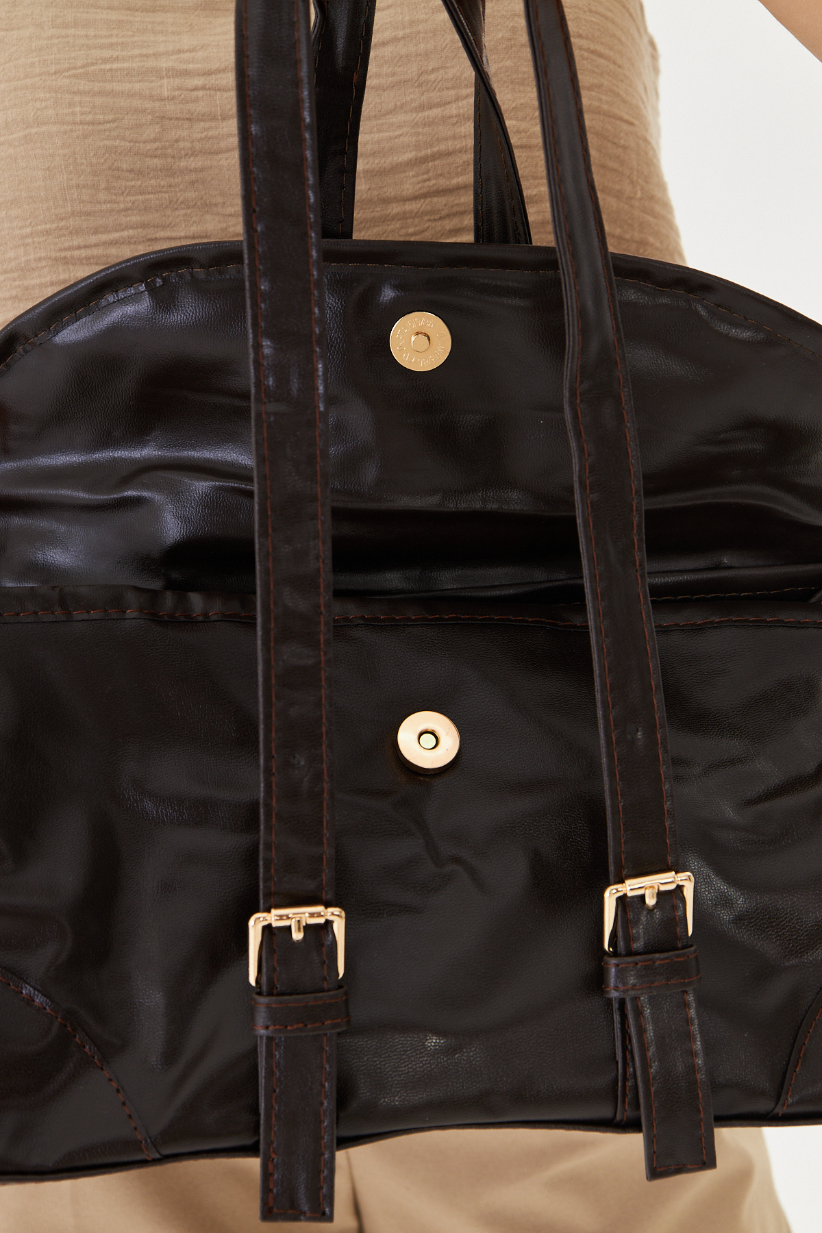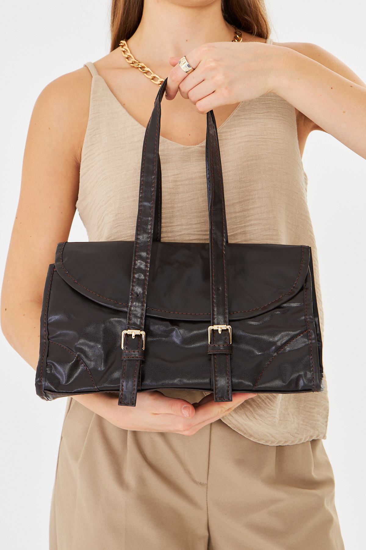 Nima Kahverengi Vintage Çift Toka Detaylı Lux Baget Çanta Nima Kahverengi Vintage Çift Toka Detaylı Lux Baget Çanta NM01 تک سایز