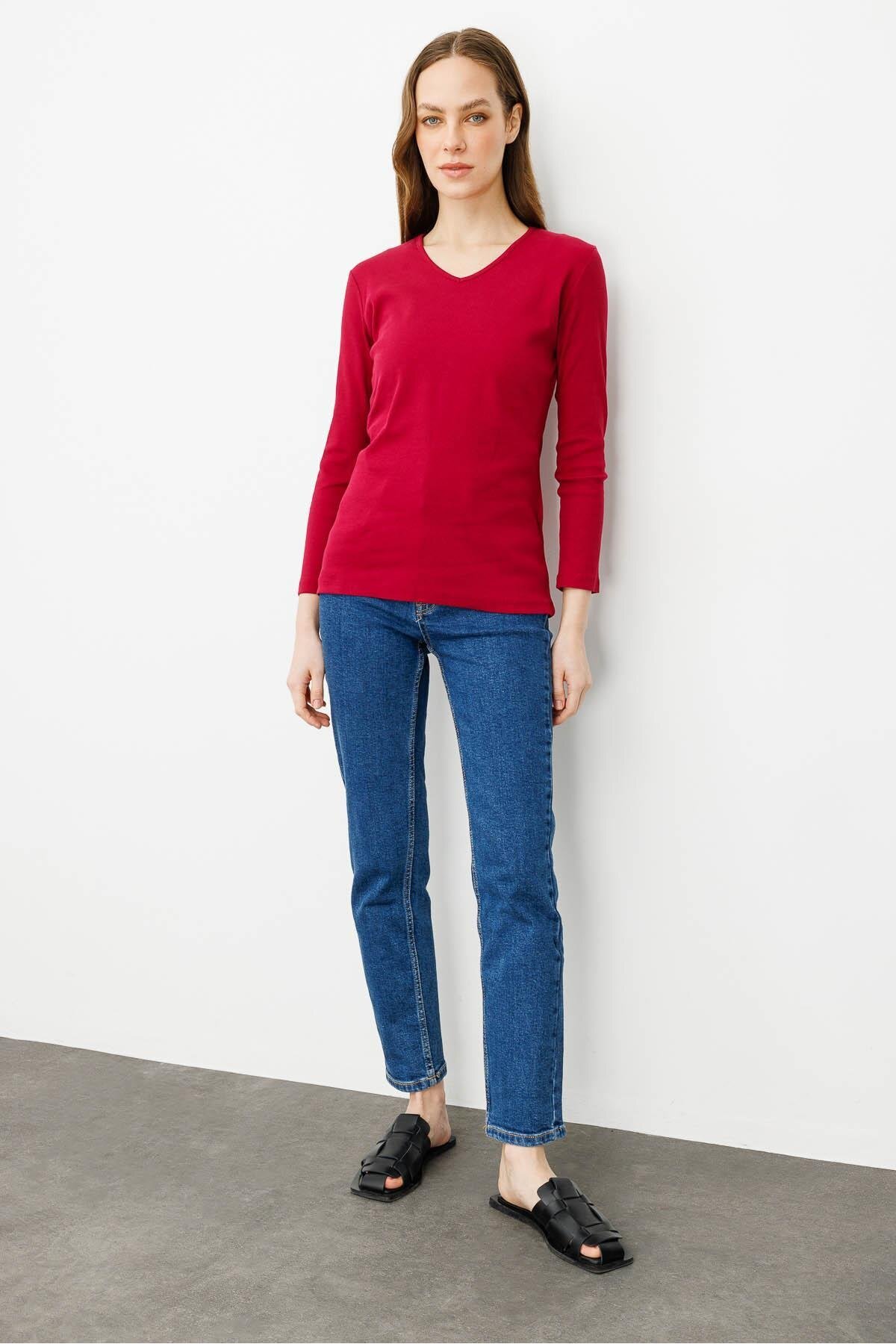 Kadın V Yaka Kaşkorse Pamuk Bluz Vişne Kadın V Yaka Kaşkorse Pamuk Bluz Vişne 20794 XL