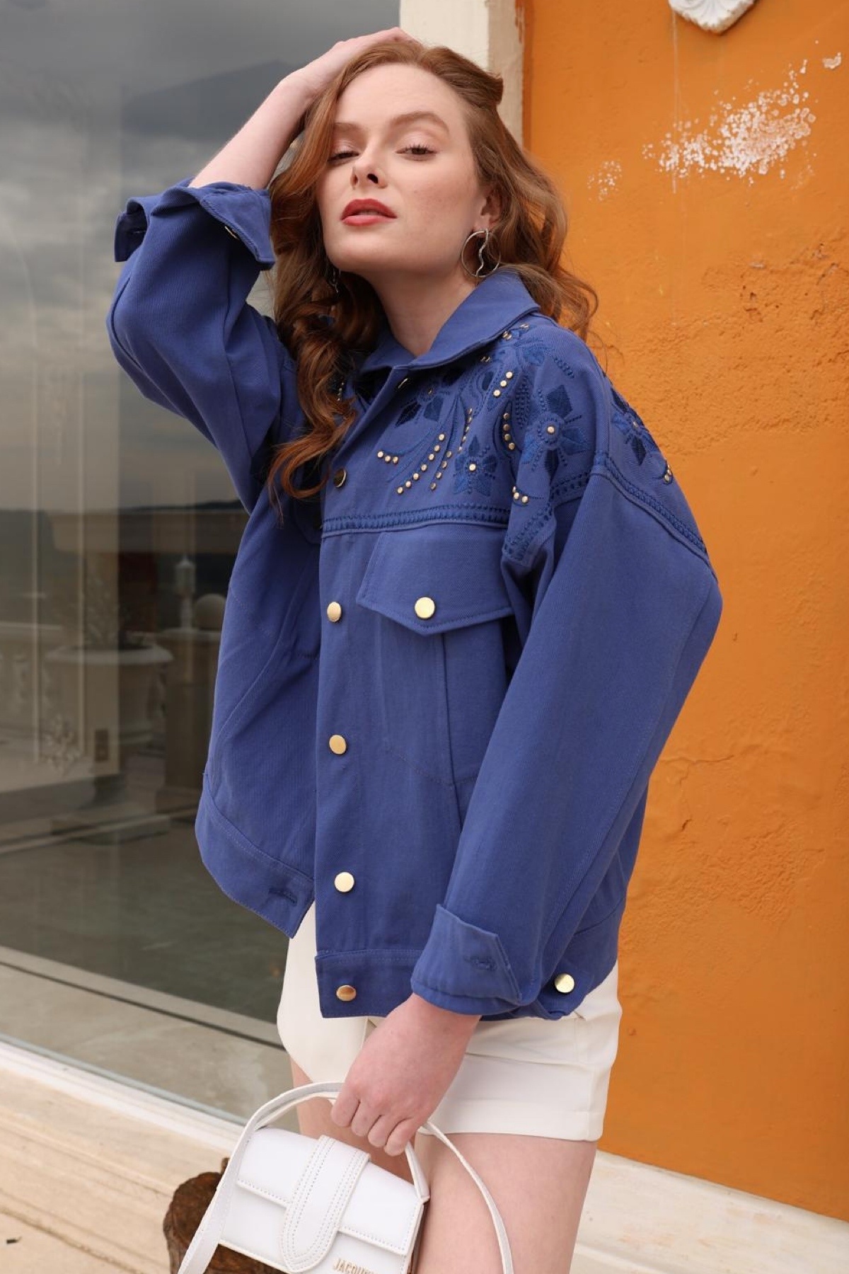 Kadın Lacivert Denim Gabardin Oversize Ceket Nakış İşlemeli Drop Detaylı Kadın Lacivert Denim Gabardin Oversize Ceket Nakış İşlemeli Drop Detaylı SHZ202 L