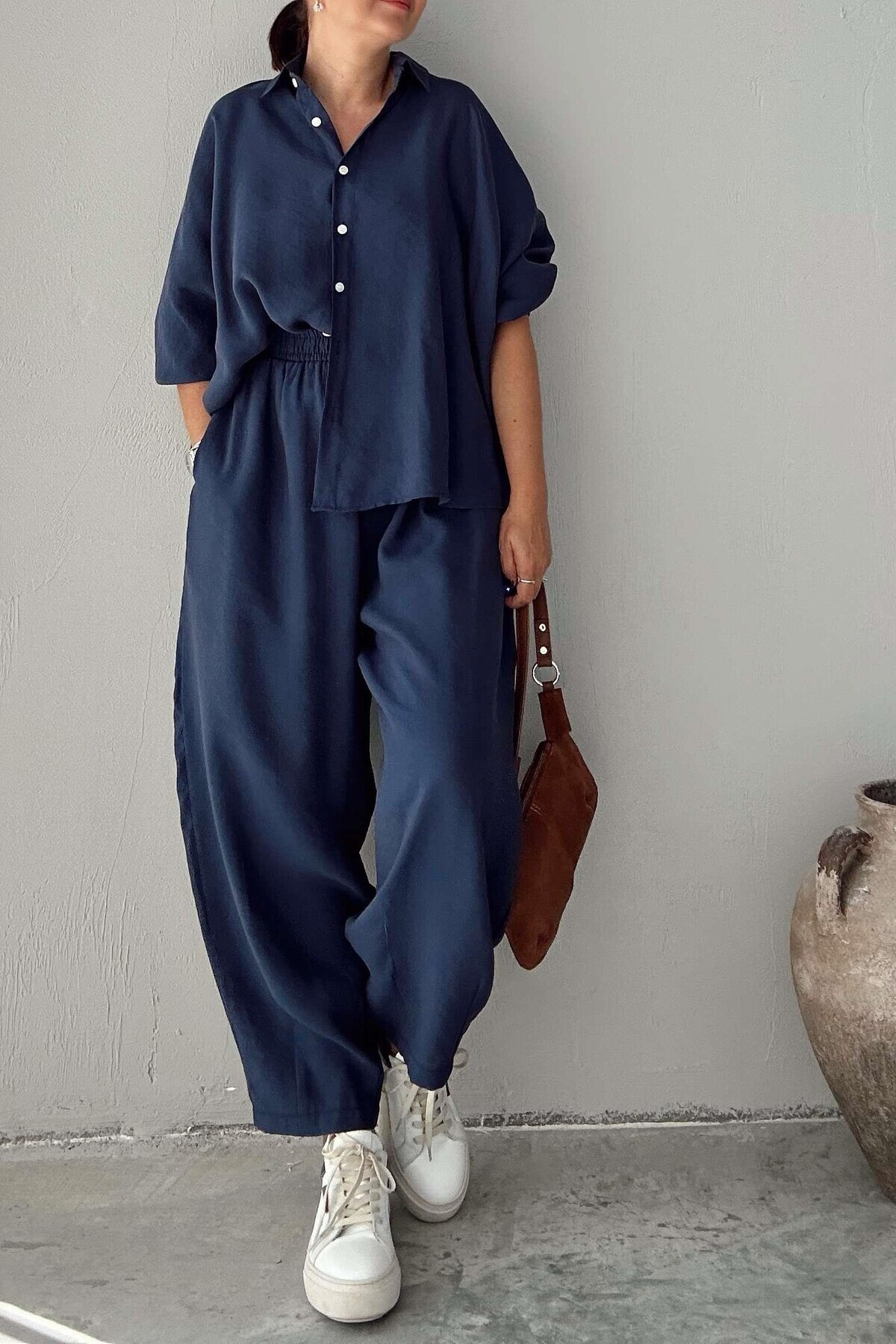 Kadın Lacivert V Yaka Önü Burgulu Balon Kol Müslin Bluz Ve Şalvar Kesim Pantolon Takım ALC-X14121 Kadın Lacivert V Yaka Önü Burgulu Balon Kol Müslin Bluz Ve Şalvar Kesim Pantolon Takım ALC-X14121 40