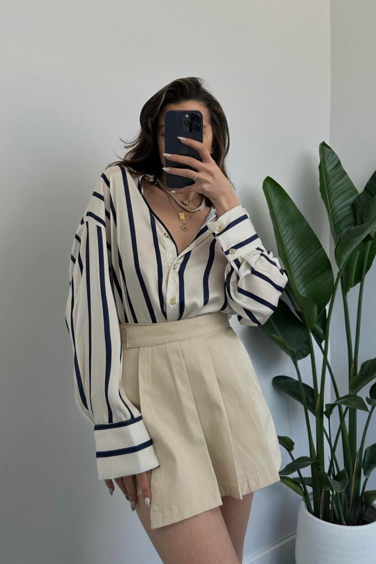Çizgili Saten Rahat Kalıp Gömlek Krem Çizgili Saten Rahat Kalıp Gömlek Krem 250722GML XL