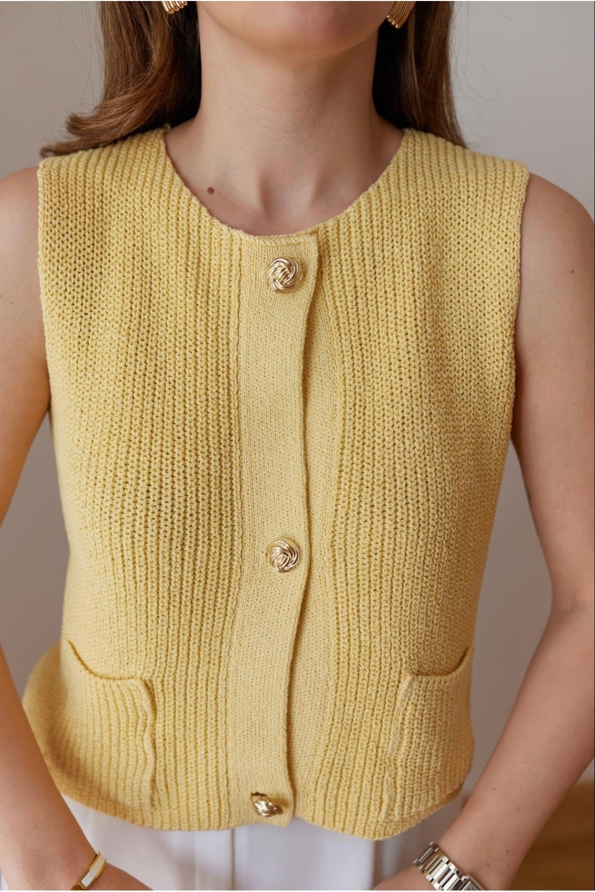 Kadın Sarı Gold Düğme Detaylı Önden İki Cepli Örme Yelek Kadın Sarı Gold Düğme Detaylı Önden İki Cepli Örme Yelek FMY25-14 Standart