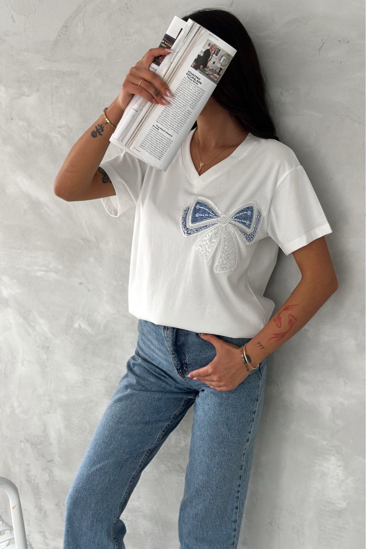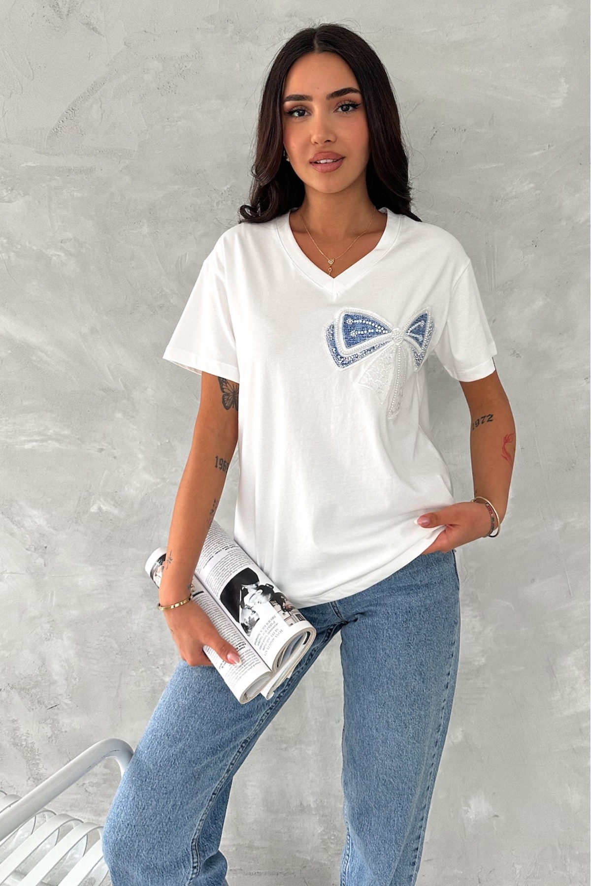 Kadın Beyaz Dikme Boncuk Ve Pul İşlemeli Fiyonk Detaylı %100 Pamuk T-shirt Kadın Beyaz Dikme Boncuk Ve Pul İşlemeli Fiyonk Detaylı %100 Pamuk T-shirt T113 XL