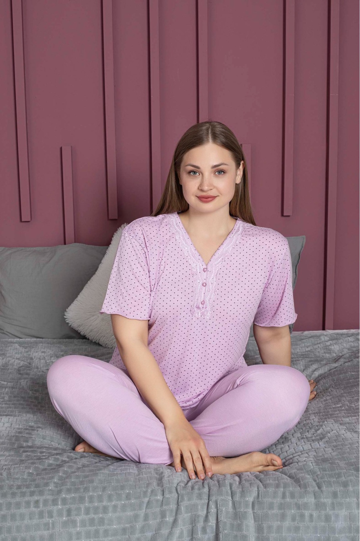 Kadın Büyük Beden Desenli Yakası Düğmeli Kısa Kollu Bambu Pijama Takımı Kadın Büyük Beden Desenli Yakası Düğmeli Kısa Kollu Bambu Pijama Takımı EFZBKK 4XL