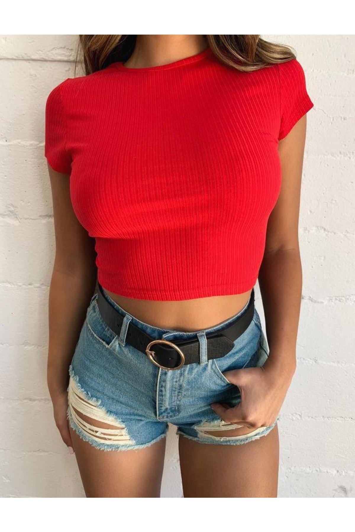 Öz Pamuk Fitilli Pamuklu Kumaş Örme Kare Yaka Crop T-shirt BLUZ Öz Pamuk Fitilli Pamuklu Kumaş Örme Kare Yaka Crop T-shirt BLUZ ÖZ PAMUK KARESi-005 L
