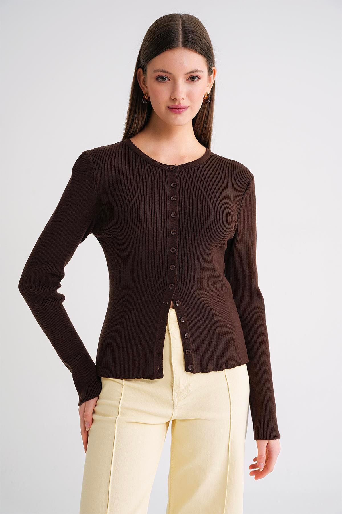6931 Kadın Düğmeli Fitilli Triko Hırka Kahve 6931 Kadın Düğmeli Fitilli Triko Hırka Kahve Y25HRK6931 L