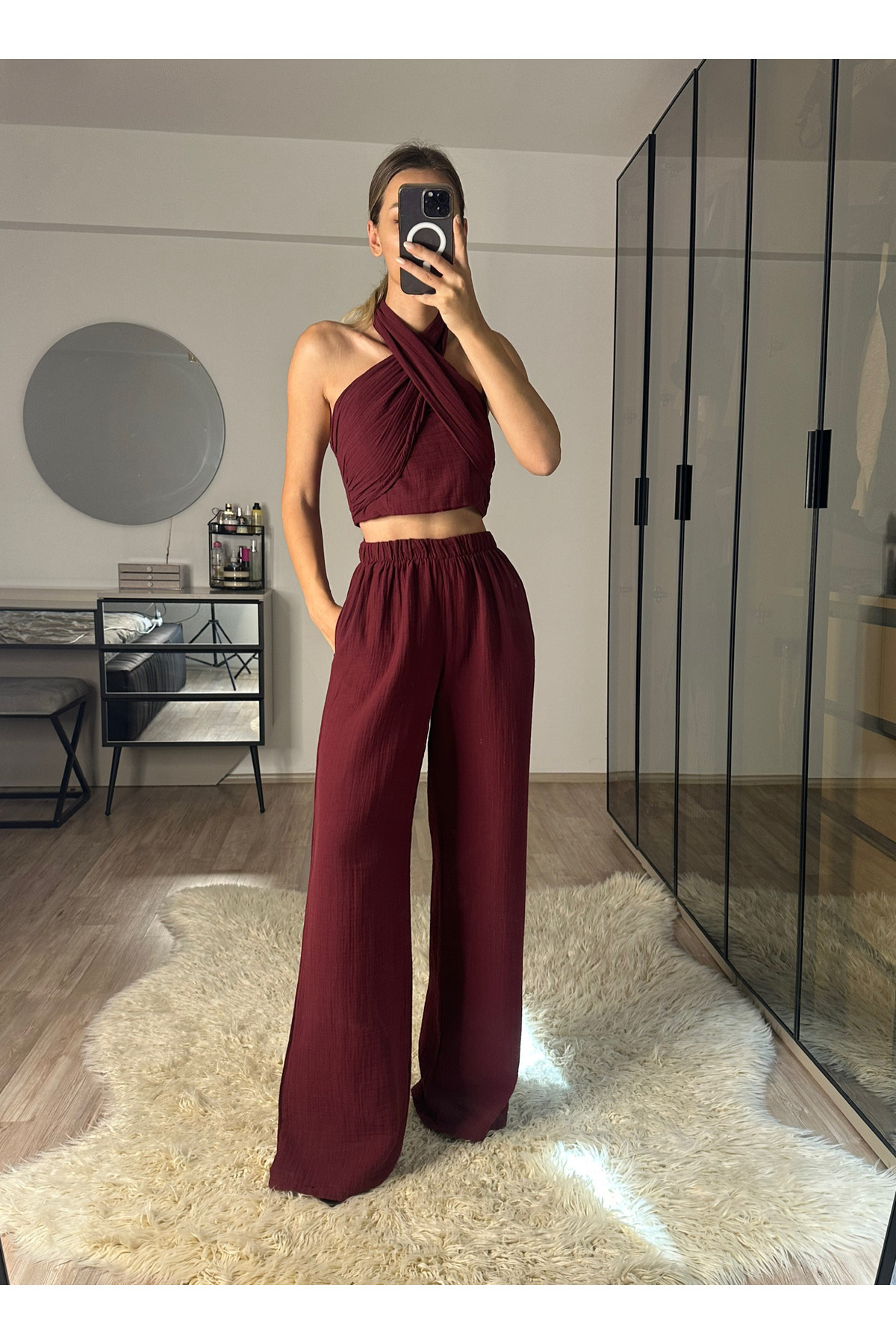 Vual Desenli Taş Baskı Detaylı Pareyo Ve Keten Desenli Bol Paça Pantolon Takım Vual Desenli Taş Baskı Detaylı Pareyo Ve Keten Desenli Bol Paça Pantolon Takım A0825Y801220001 42