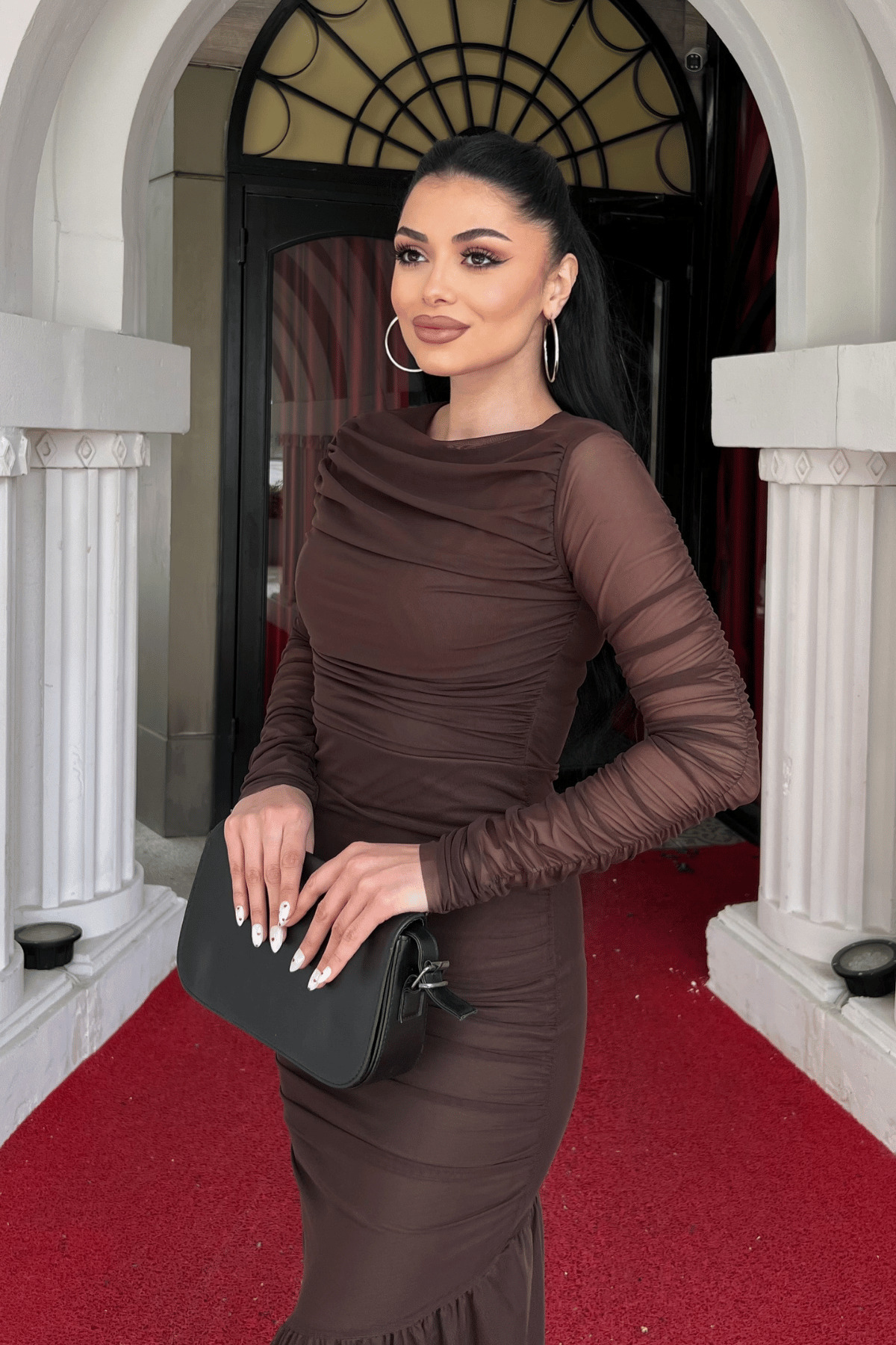 Tül Kumaş Büzgü Detaylı Kalem Elbise - KAHVERENGİ Tül Kumaş Büzgü Detaylı Kalem Elbise - KAHVERENGİ GYM-5433 46