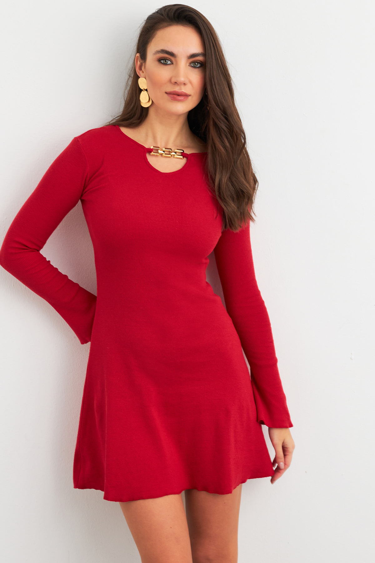 Kadın Ekru-Kırmızı Desenli Şifon Mini Elbise ROP107 Kadın Ekru-Kırmızı Desenli Şifon Mini Elbise ROP107 L