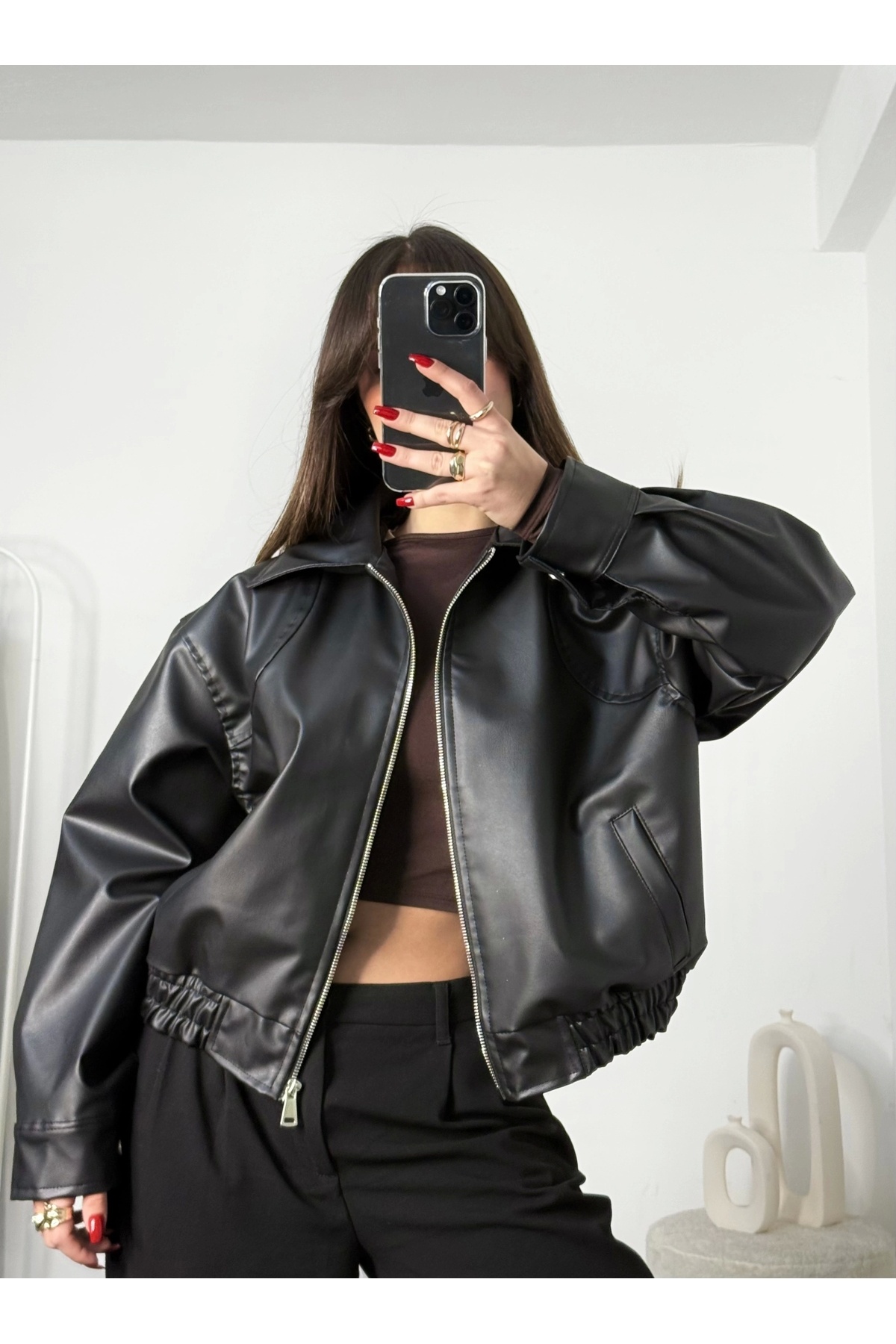Yaka Detaylı Deri Bomber Ceket Yaka Detaylı Deri Bomber Ceket BKC0056 XL