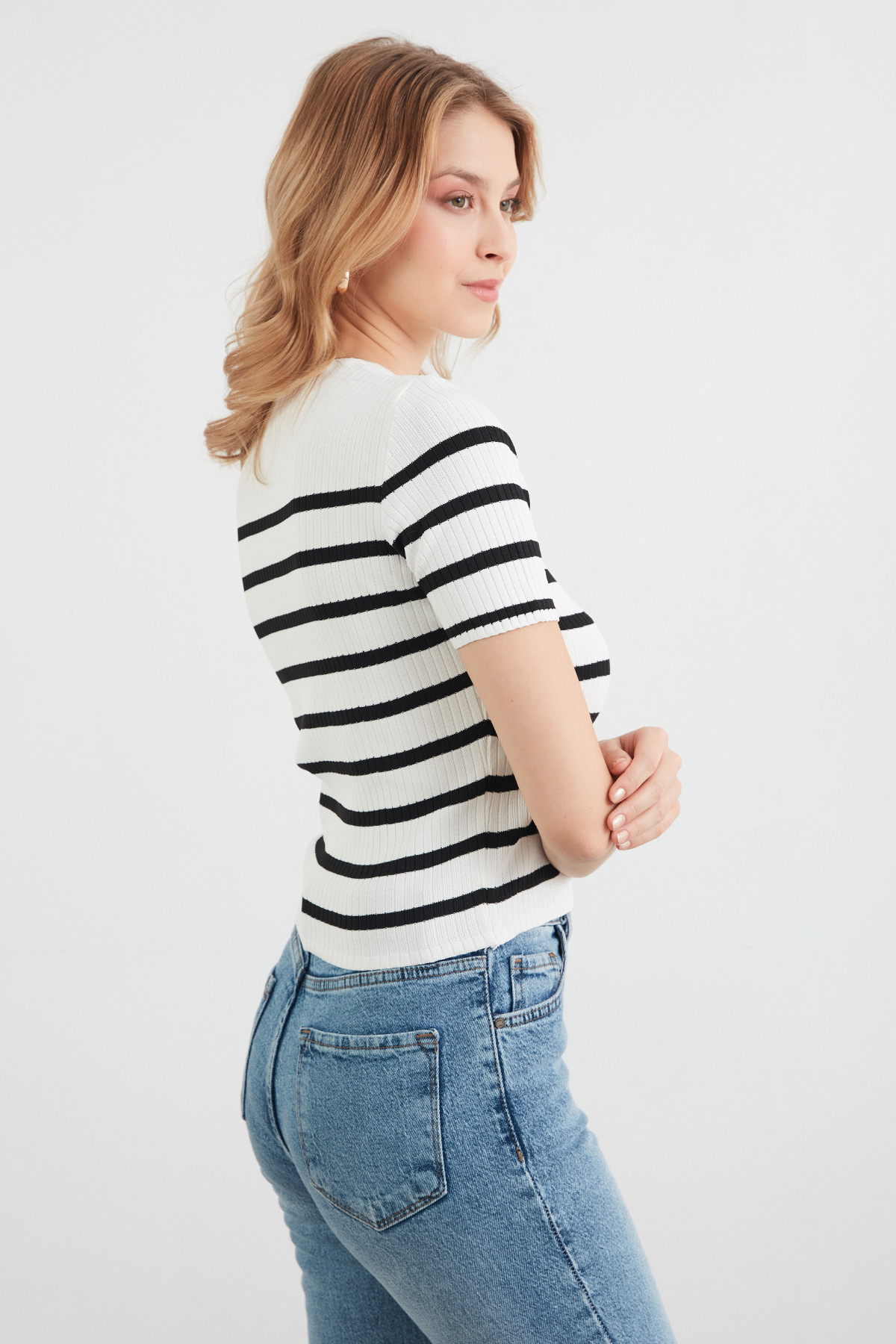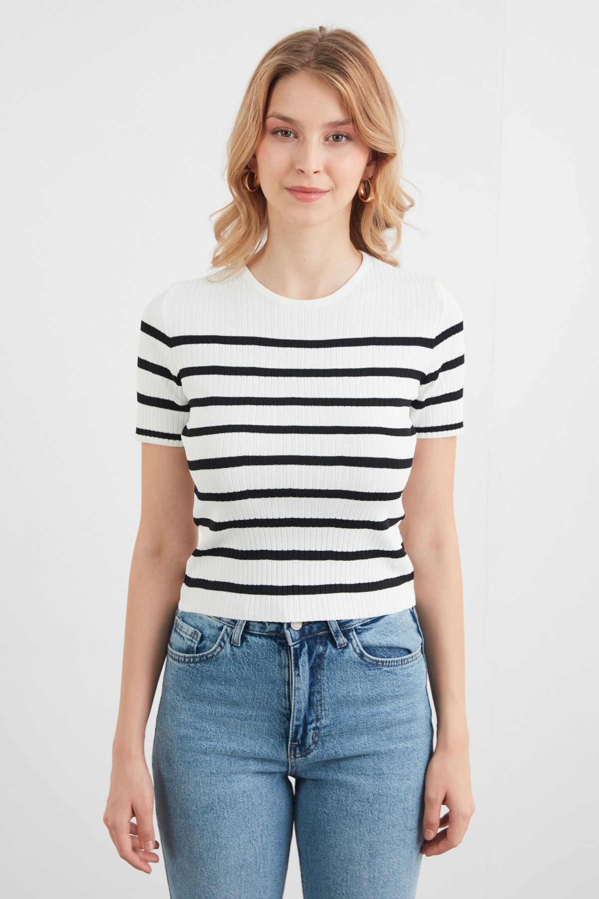 Çizgili Fitilli Bisiklet Yaka Triko Bluz Çizgili Fitilli Bisiklet Yaka Triko Bluz 25YGB7726129778 S/M