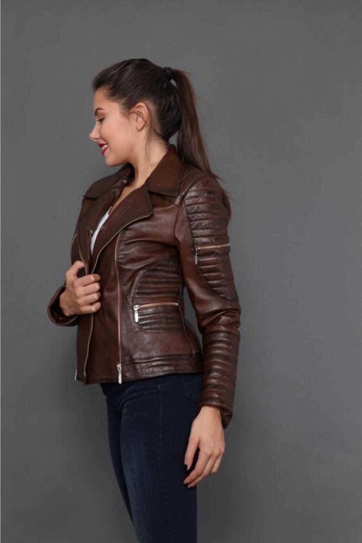 Hakiki Kuzu Derisi Kollları İşlemeli Fermuarlı Kadın Ceket Kahverengi Hakiki Kuzu Derisi Kollları İşlemeli Fermuarlı Kadın Ceket Kahverengi dw-05-32-41 3XL
