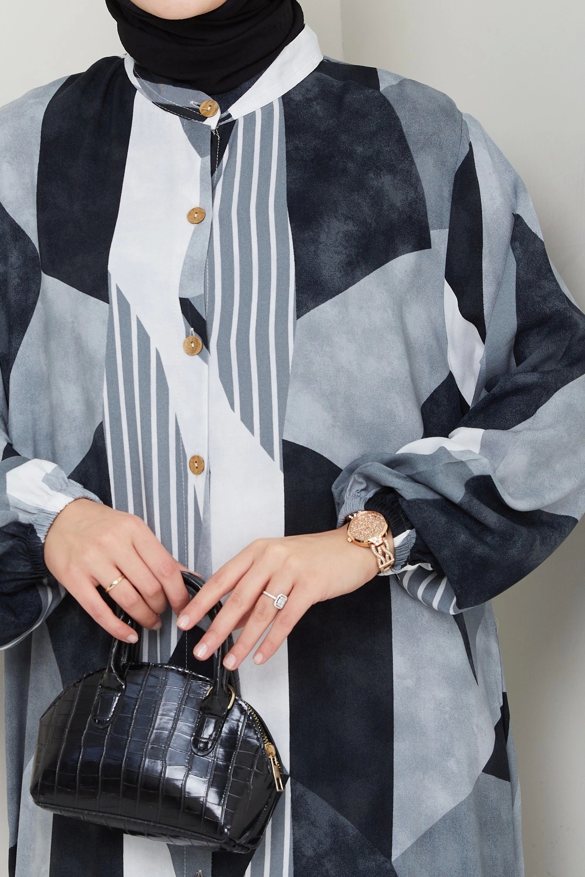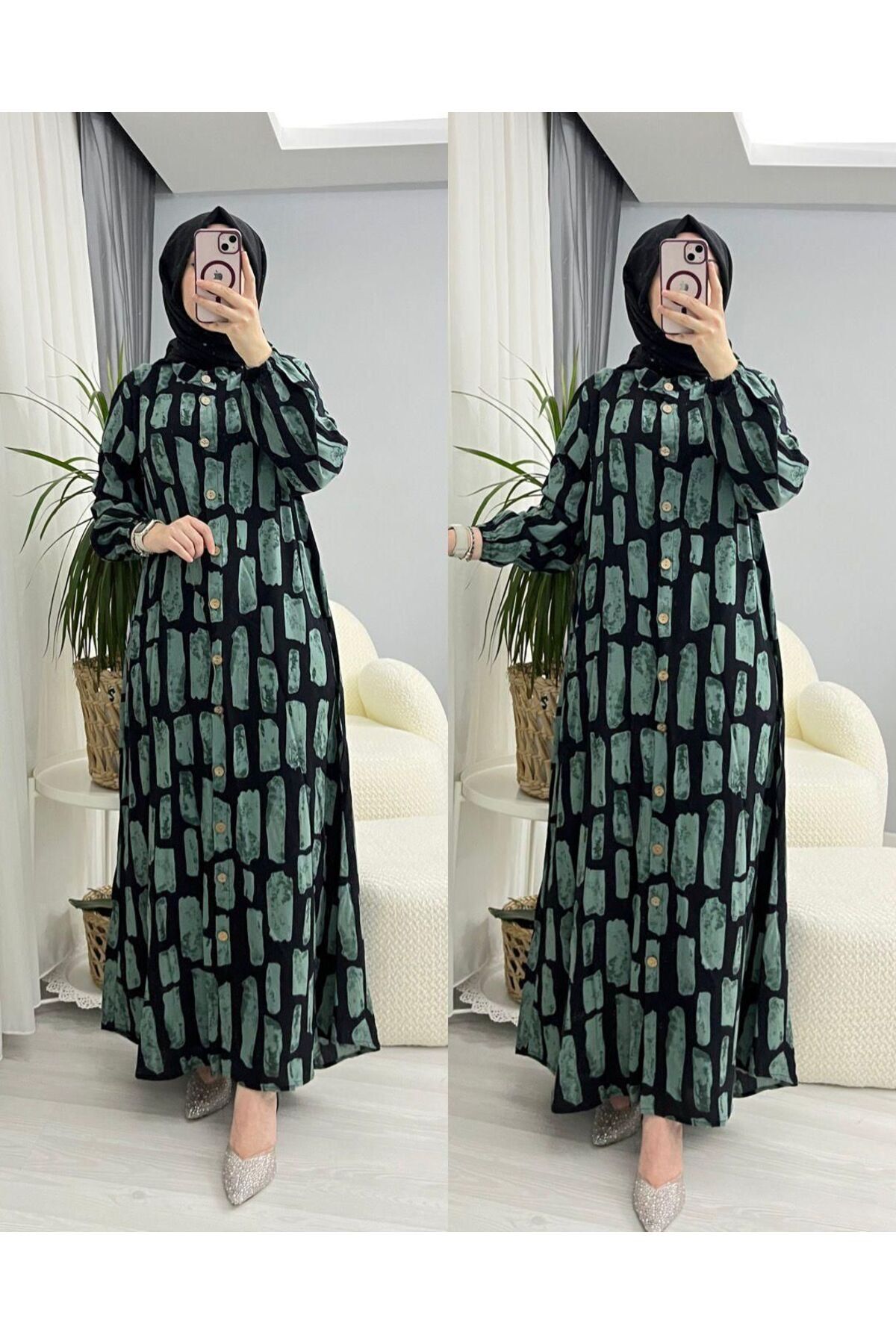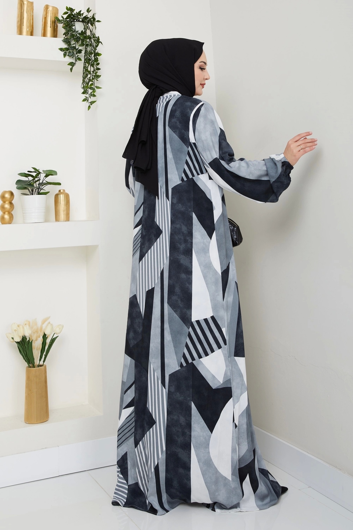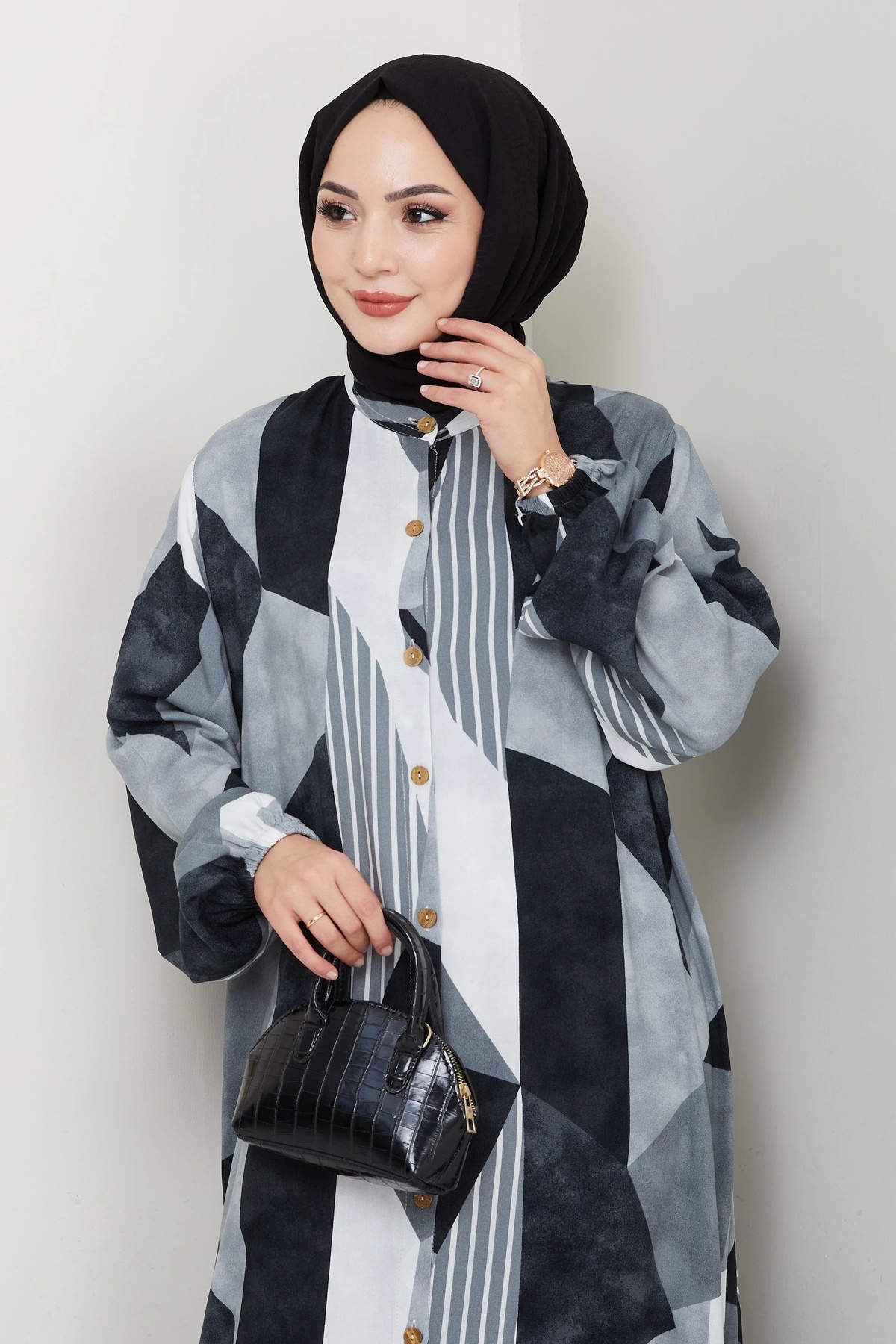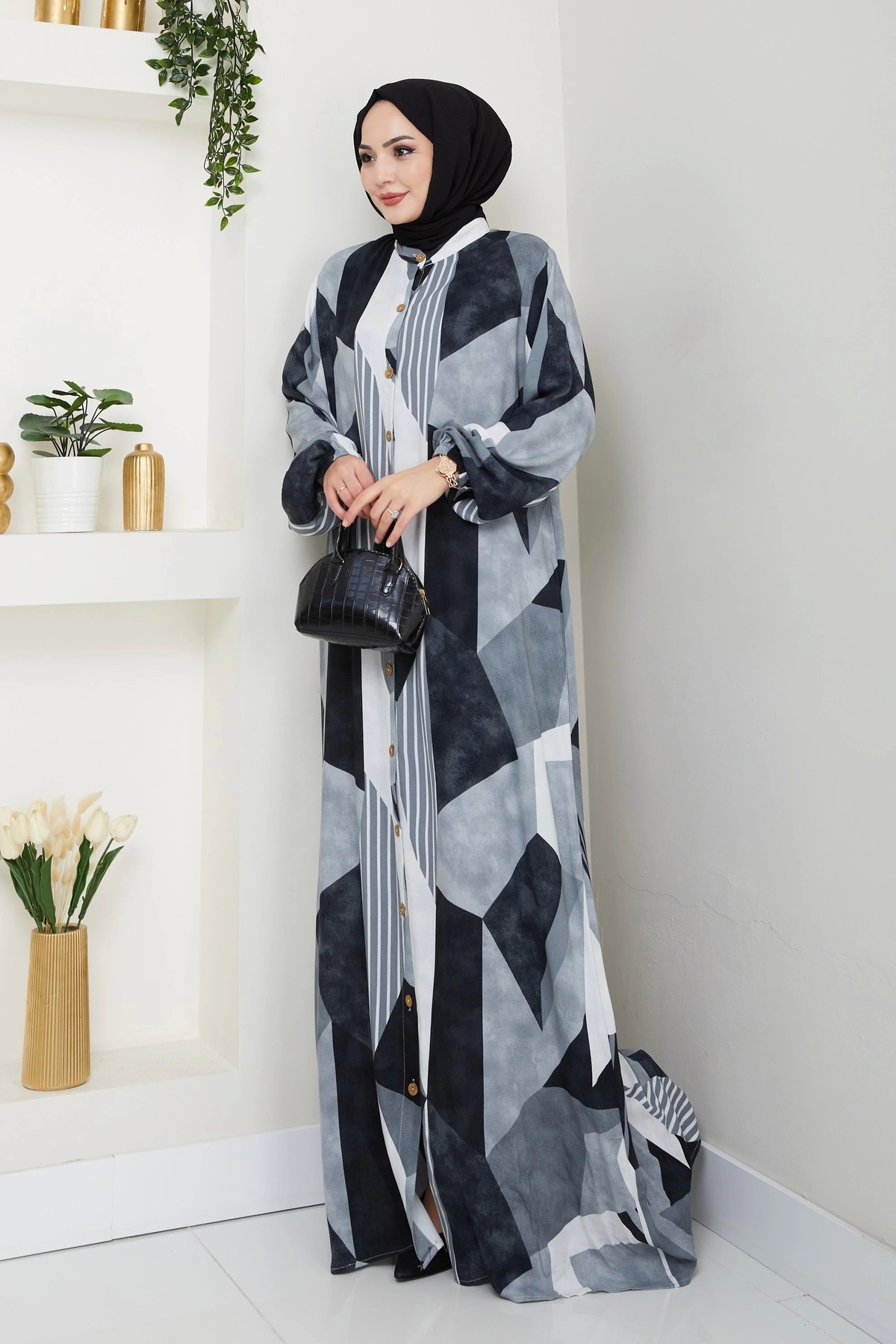 Viskon Boydan Düğmeli Elbise gri siyah Viskon Boydan Düğmeli Elbise gri siyah 113 50-52