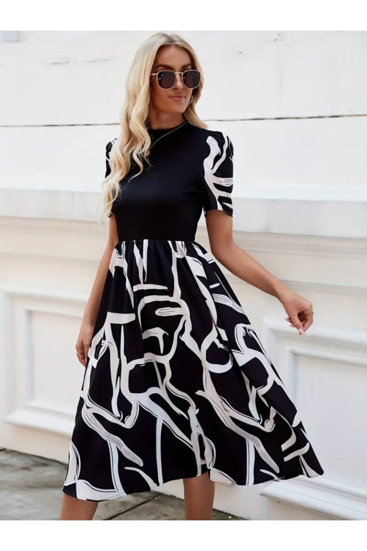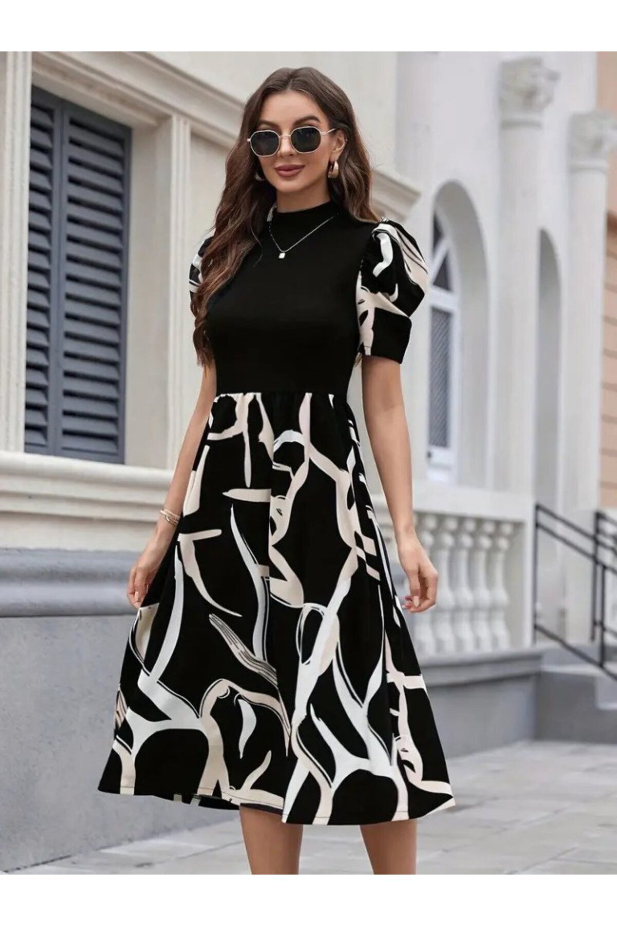 Yarı Balıkçı Yaka Kısa Kollu Üst Viskon Alt Desenli Dokuma Atlas Kumaş Elbise Yarı Balıkçı Yaka Kısa Kollu Üst Viskon Alt Desenli Dokuma Atlas Kumaş Elbise 61466 2XL-3XL