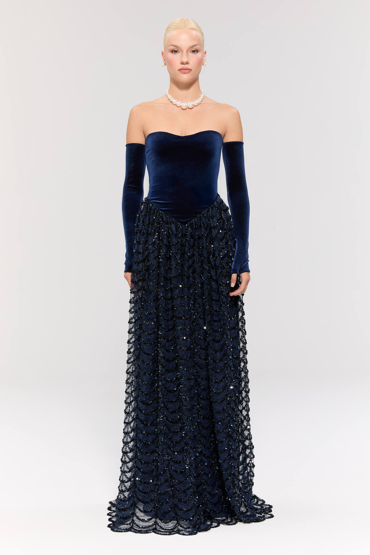 Straplez Eteği Payetli Tül Uzun Abiye Elbise Alfa Beta Straplez Eteği Payetli Tül Uzun Abiye Elbise Alfa Beta B7120 46