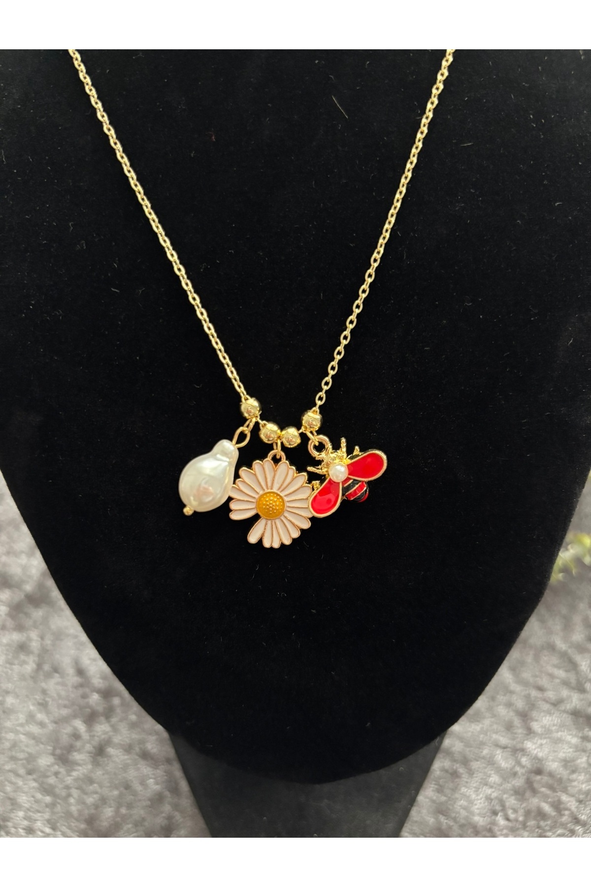 Altın Renkli Çiçek Arı ve İnci Detaylı Çelik Kolye – Bahar Enerjisi ✨ Altın Renkli Çiçek Arı ve İnci Detaylı Çelik Kolye – Bahar Enerjisi ✨ MS165 Standart