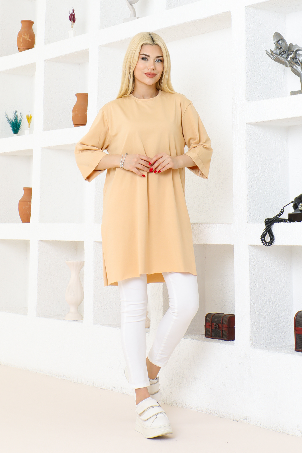 Kadın Bej Oversize Tunik Tişört – Yarım Kollu, Yuvarlak Yaka, Rahat Kesim Kadın Bej Oversize Tunik Tişört – Yarım Kollu, Yuvarlak Yaka, Rahat Kesim NCRKADINOVERSIZETISORT 42