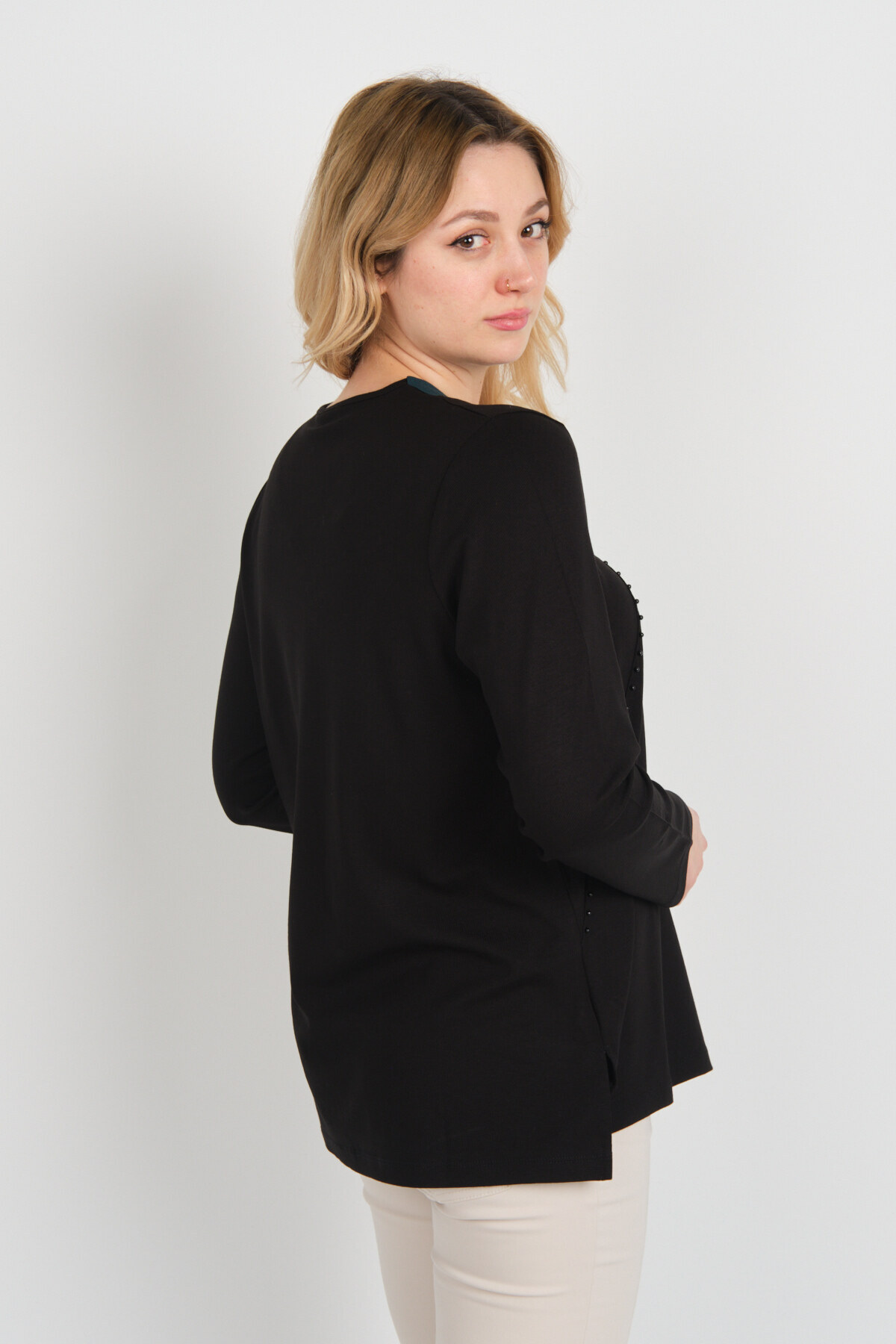 Kadın Yaka Detaylı Boncuk İşlemeli Yandan Yırtmaçlı Anne Bluz 5725 Siyah Kadın Yaka Detaylı Boncuk İşlemeli Yandan Yırtmaçlı Anne Bluz 5725 Siyah 804432025725 XL