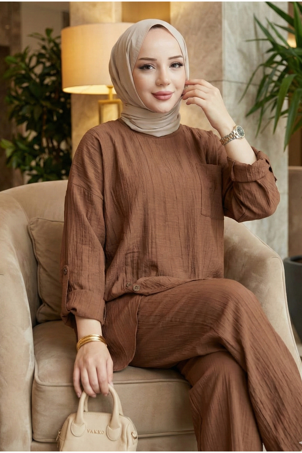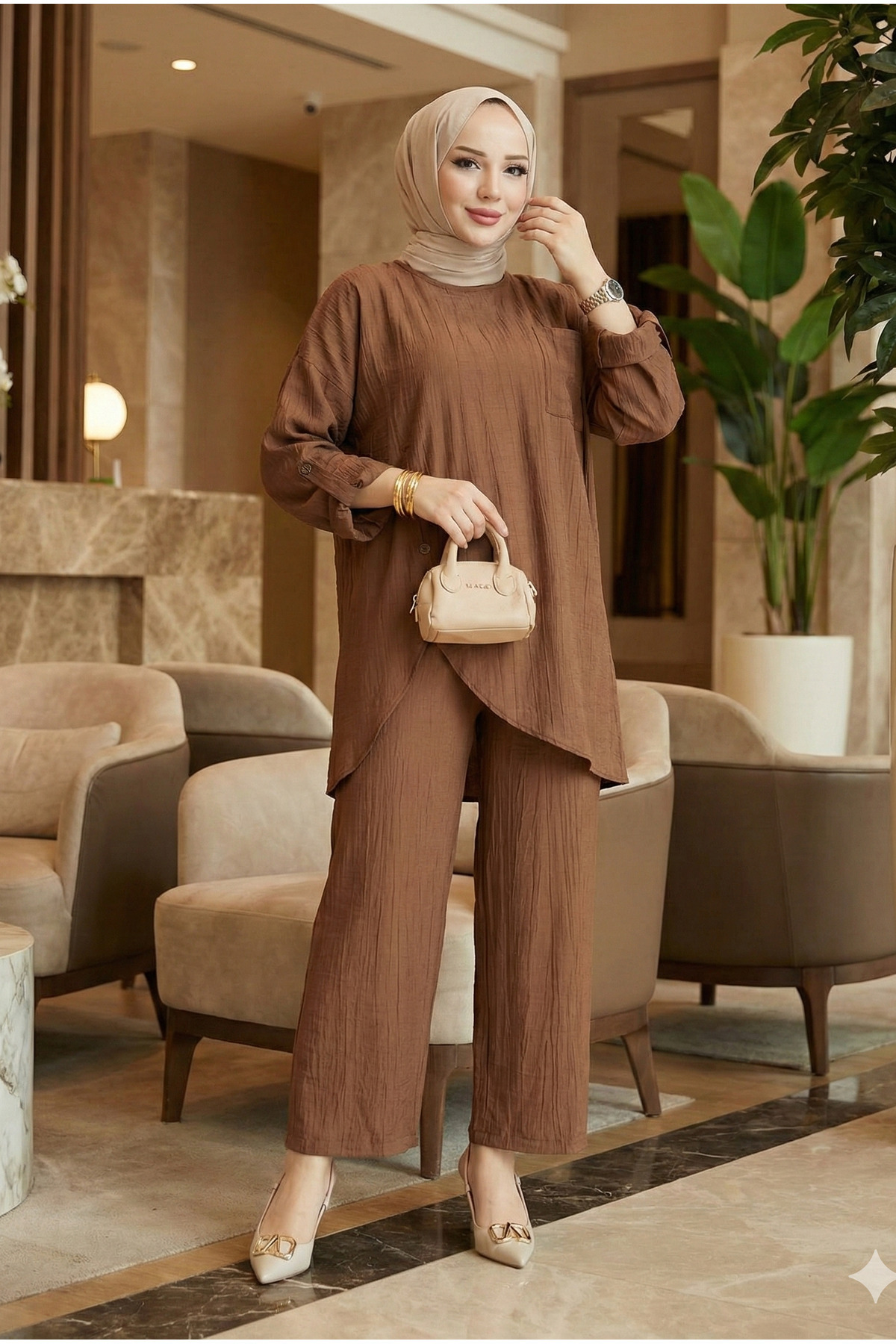 Kadın Kahverengi Çilek Kumaş Asimetrik 2li Tesettür Tunik Pantolon Ikili Pantolonlu Takım Kadın Kahverengi Çilek Kumaş Asimetrik 2li Tesettür Tunik Pantolon Ikili Pantolonlu Takım NECLA TAKIM 48